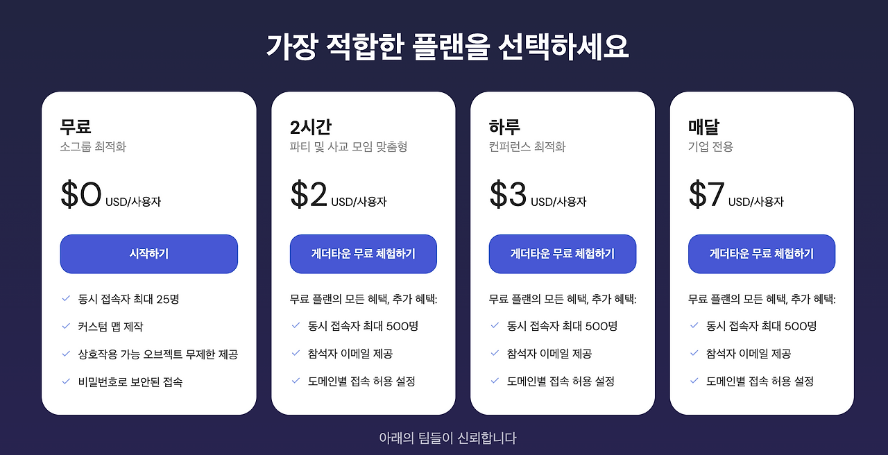 동시접속자 25명까지 무료로 이용하실 수 있습니다. 이용 시간 별로 요금이 따로 있고 엔터프라이즈 전용도 따로 있습니다. 요금을 지불하면 이메일로 초대장을 보낼 수도 있고 특정 도메인을 이용할 수도 있습니다. 자세한 내용은 공식 홈페이지에서 확인해 보세요.