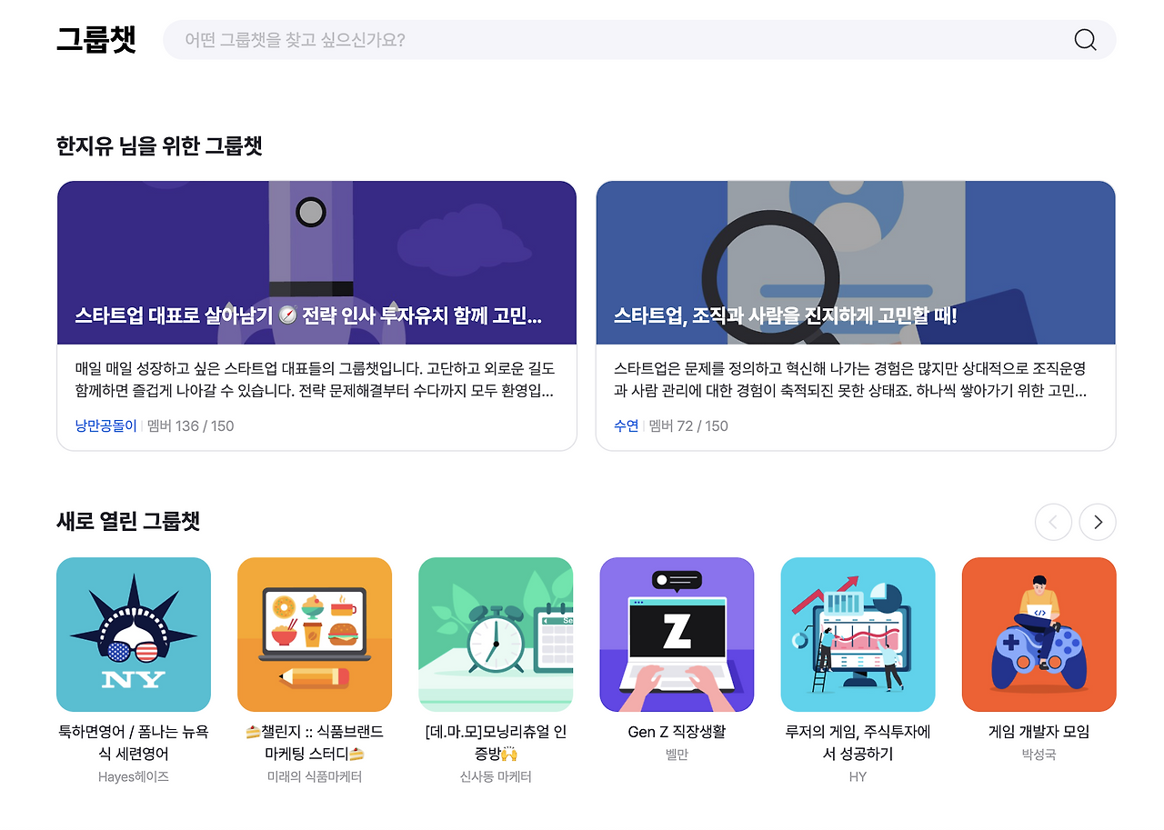 그룹챗은 주로 실무자들이 운영을 하는 데 스타트업, UX, PM, 개발, 디자인, 마케팅 등 다양한 카테고리가 있고 한 카테고리 내에도 다양한 그룹챗이 있습니다. 그룹챗 내에서는 ‘커뮤니티 빌더'라고 불리는 그룹챗 방장이 양질의 글을 큐레이션 해서 주기적으로 공유하거나, 자유롭게 질문하고 답변하는 분위기입니다.