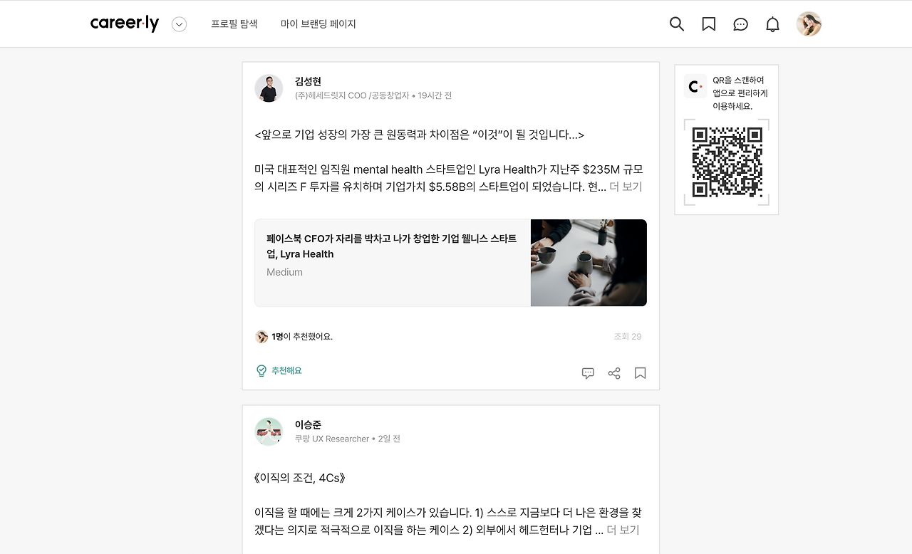 커리어리는 말 그대로 커리어 SNS입니다. 실무자들 위주로 양질의 글을 큐레이션 해서 공유하기 때문에 해당 업계에서 중요한 정보들, 트렌디한 정보들을 빠르게 얻을 수 있습니다.