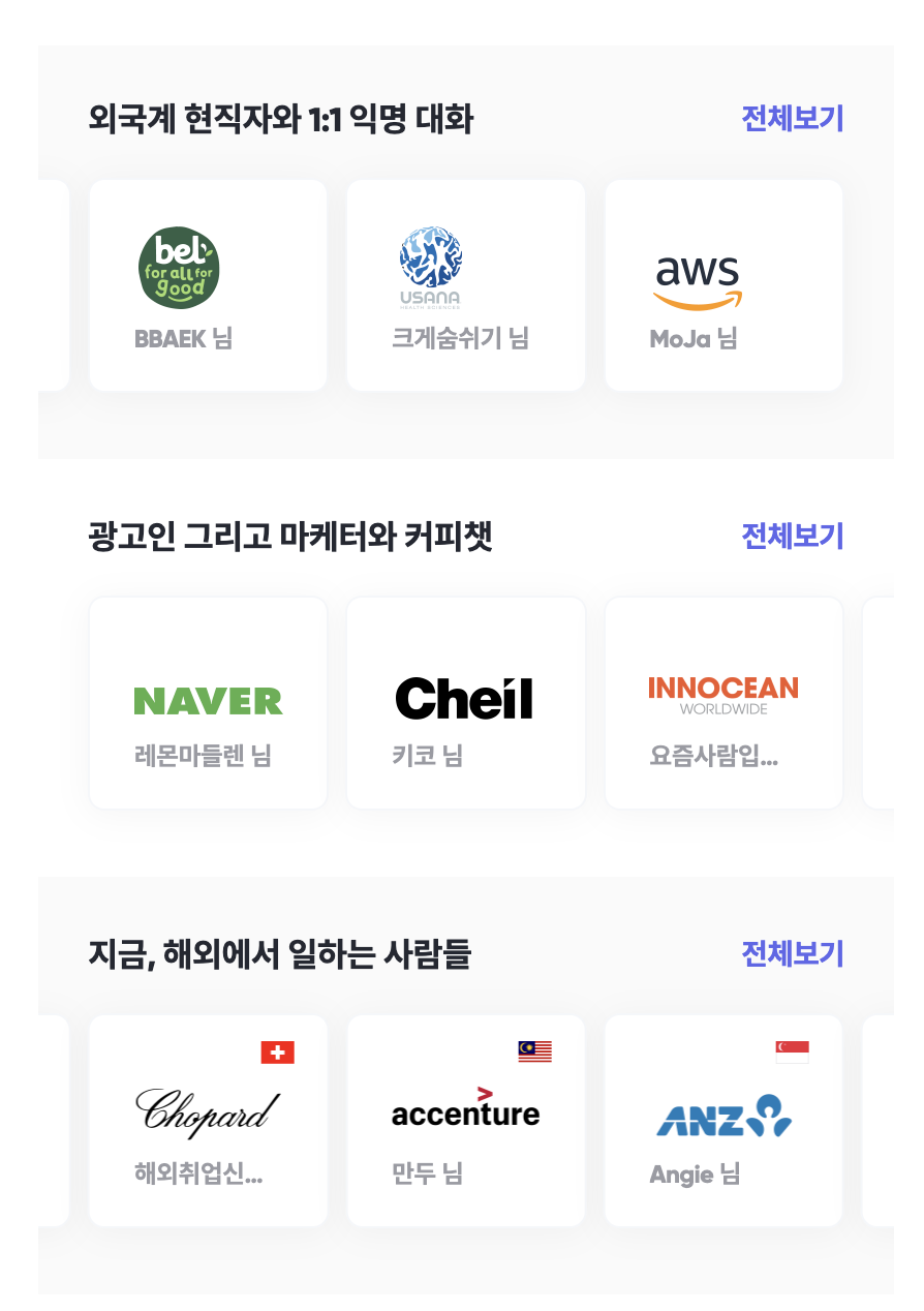 커피챗 파트너를 찾을 때는 파트너의 특성 별, 직무 별로 찾을 수 있고, 파트너 탐색 → 일정 선택 → 사전 질문 작성 → 1:1 익명 음성 커피챗 20분 진행의 절차로 이뤄집니다. “익명성을 보장받으면서도 특정 회사나 직무에 대한 퀄리티 높은 정보를 얻을 수 있다"는 장점이 있습니다.