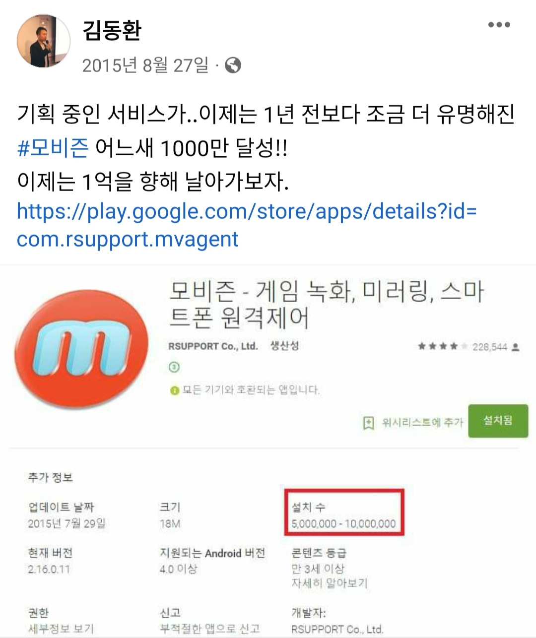 이 중에 몇 가지 기억에 남는 이벤트를 말씀드려 보자면 모비즌이 2016년 올해를 빛낸 앱에 선정되기 전년도인 2015년에 발생한 이벤트예요. 모비즌이라는 앱은 안드로이드 화면을 녹화하는 앱인데, 다른 앱의 화면을 녹화하고 사용자들은 녹화한 영상을 유튜브나 네이버 카페 등에 공유하다 보니까 저작권 관련된 이슈가 참 많았어요. 이를테면 사용자들이 간혹 강의를 녹화해서 그 자료를 무단으로 배포를 하는 거예요. 원래는 게임을 할 때 게임 플레이를 녹화해서 자랑도 하고 플레이를 어떻게 하면 좋은지 공략에 대해 공유하라고 만든 건데 의도와는 다른 행태로 쓰이게 된 거죠.