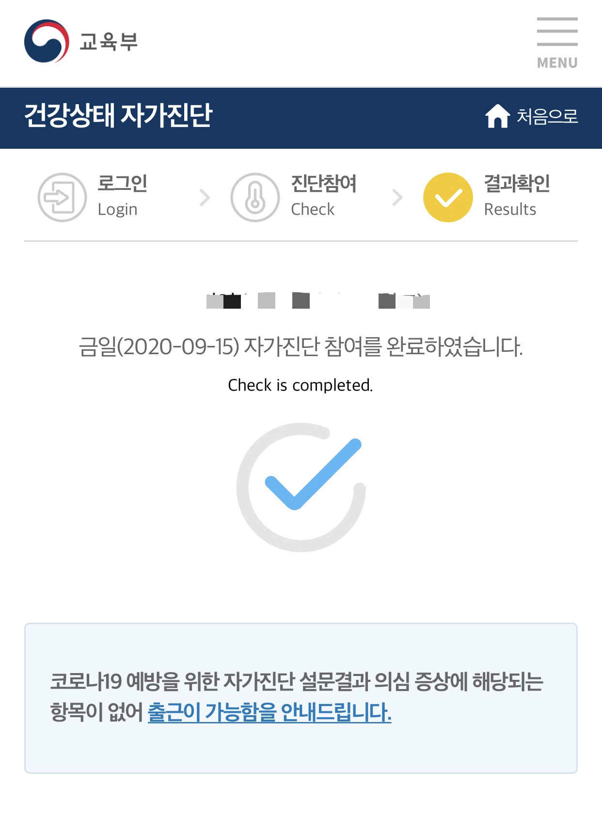 아침에 일어나 교육부에서 만든 ‘건강상태 자가진단’ 앱을 이용해 열이 있는지 해당하는 증상은 없는지, 함께 거주 중인 가족 중 코로나 확진 판정을 받은 사람이 있는지 등을 체크해서 전송한다. ‘출근이 가능함을 안내드립니다.’ 문구가 뜨는 걸 확인하고 출근길에 나선다.