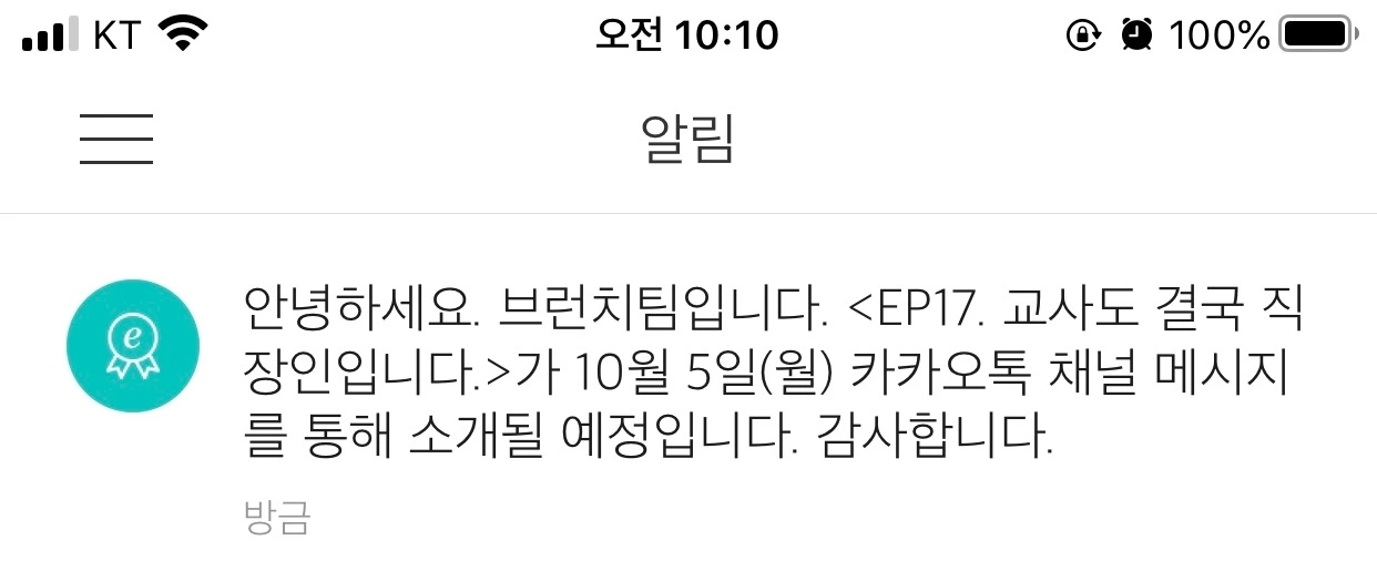 9월 28일, 10월 5일에 카카오톡 채널 메시지를 통해 내 글이 소개된다는 소식을 듣고 처음엔 그러려니 했다. 이미 다음 직장 IN 메인과 브런치 홈에 공개가 된 글이고 요즘 시국에 맞는 소재로 쓴 글이니 한 번 더 소개되는 거겠지 덤덤한 마음이었다.