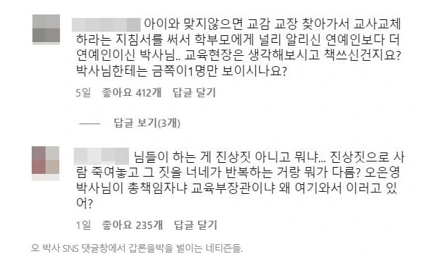 또 다른 기사도 봤는데 교사의 교권 추락에 한몫했다며 오은영 박사를 욕하는 사람들과 반대하는 의견을 가진 사람들끼리 싸우고 있다.