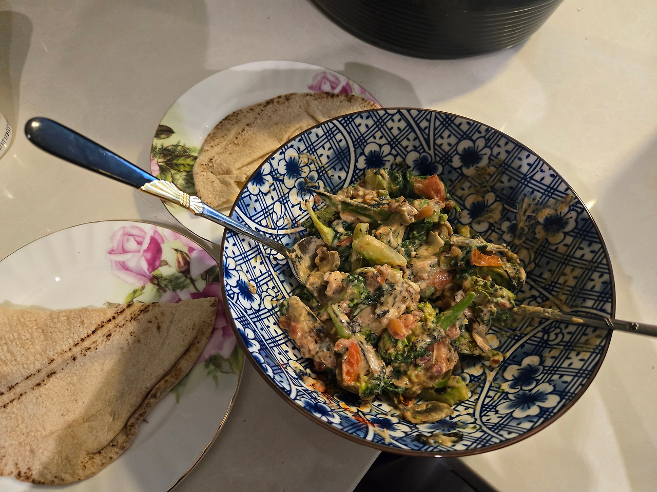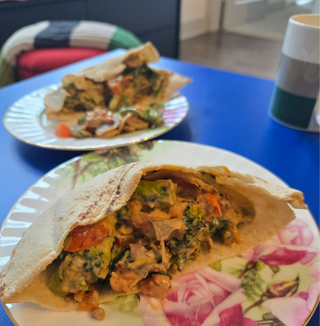 "브로콜리, butternut squash humus(땅콩호박 후무스), 버섯, 양배추, 타히니소스, 피타브레드"
