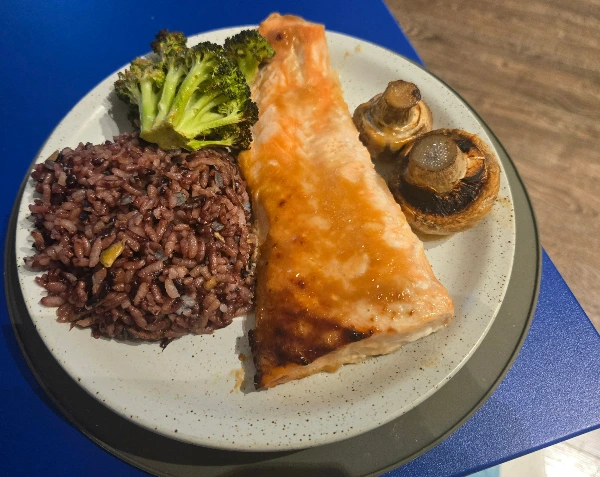 "사람들이 좋아하는 연어 스테이크 레시피가 있는 거 알아? 연어를 미소 페이스트를 발라서 같이 구운 후에 코코넛밀크로 한 밥 위에 올리면 끝이야."