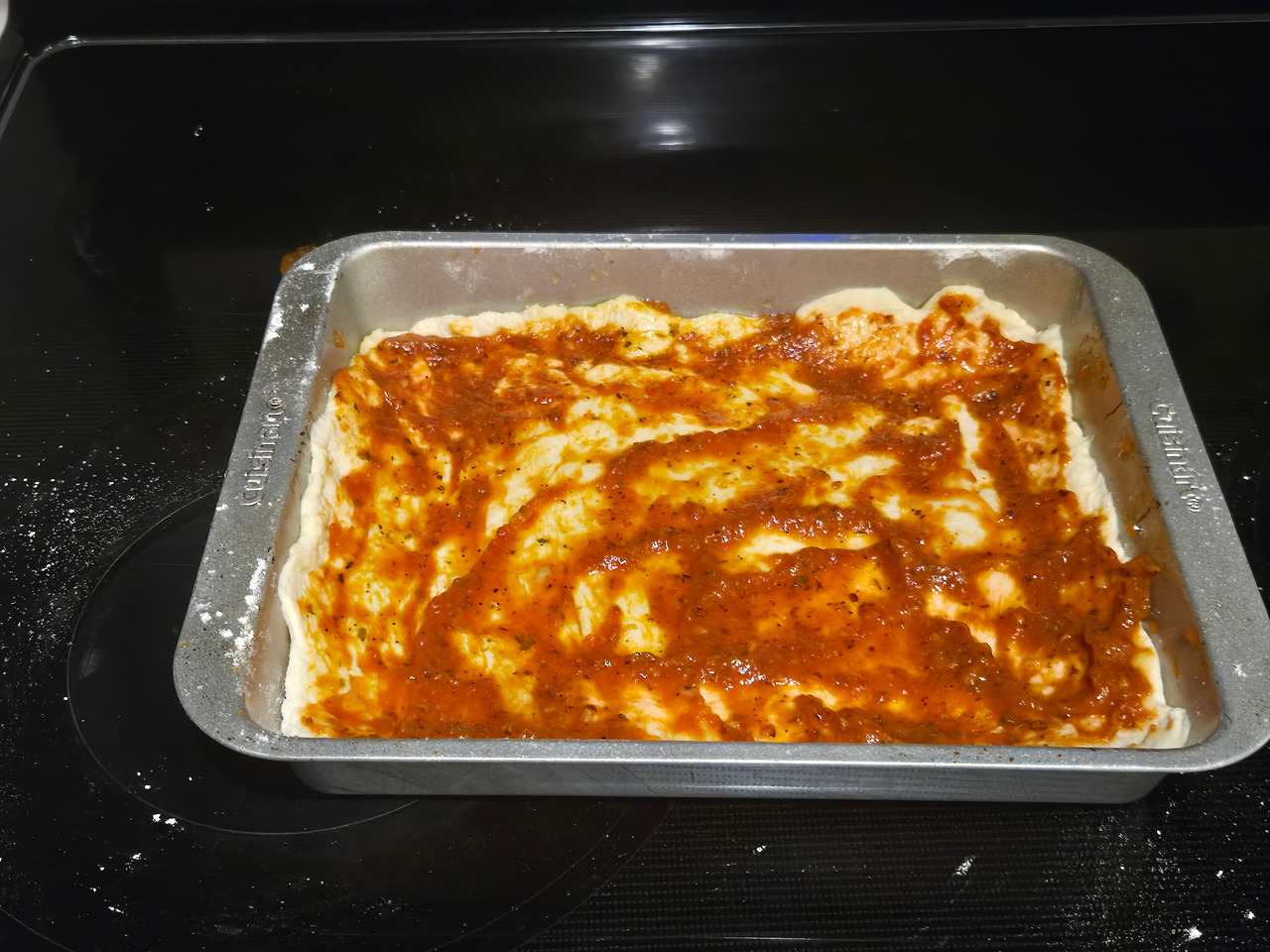 올리브유를 뿌린 오븐 그릇에 도우를 얇게 펴주고, 토마토소스를 바릅니다.
