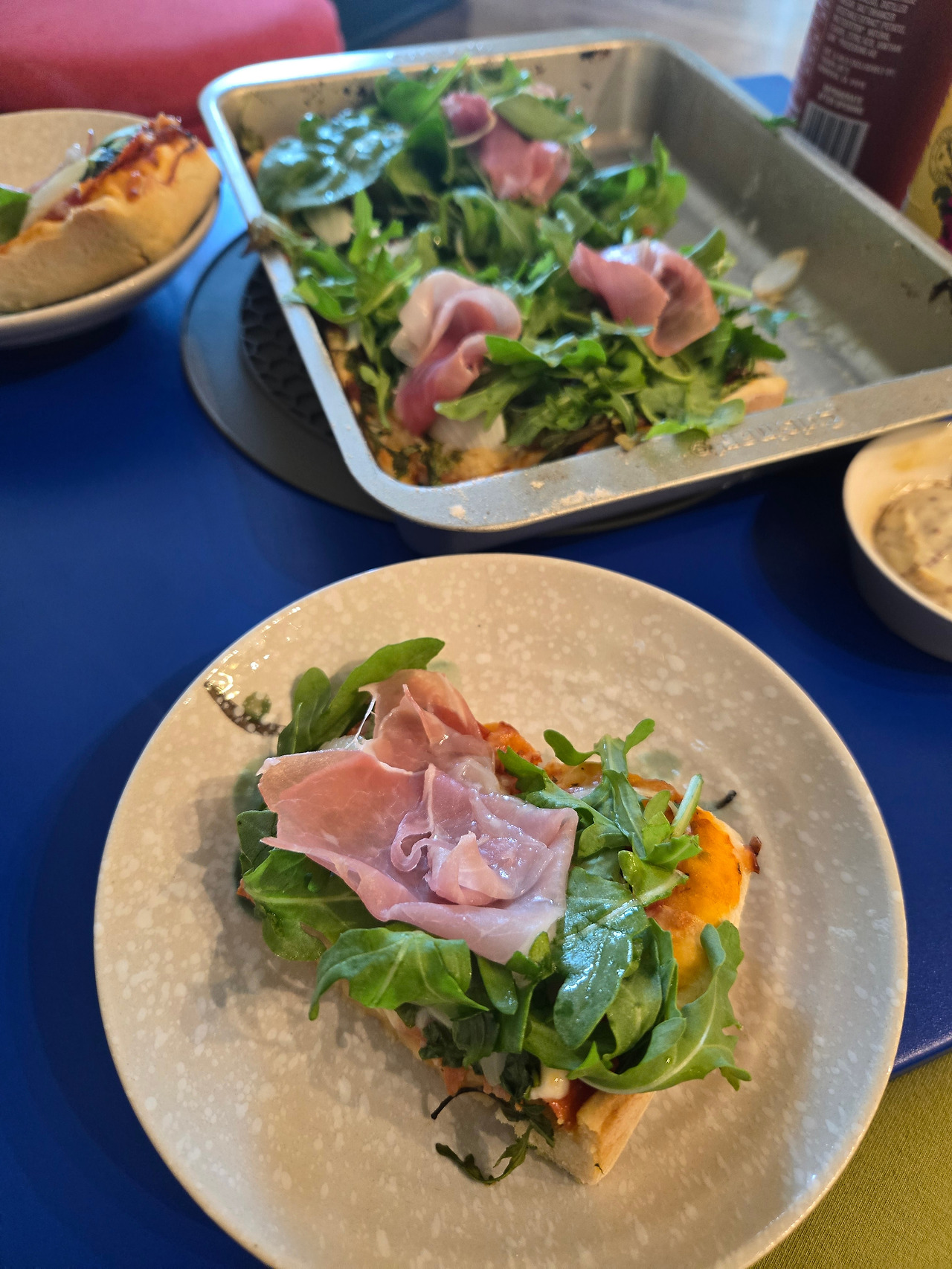 잘 구워진 피자에 루꼴라를 올리고 그 위에 프로슈토를 올려 먹었어요.