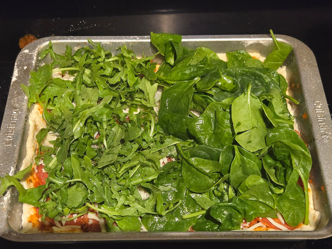 페퍼로니와 치즈를 올리고 한쪽에는 루꼴라, 다른 한쪽에는 시금치를 올렸습니다. 채소는 오븐에 들어갔다 나오면 숨이 다 죽어서 가장 마지막에 토핑으로 더 올려줄 예정입니다.
