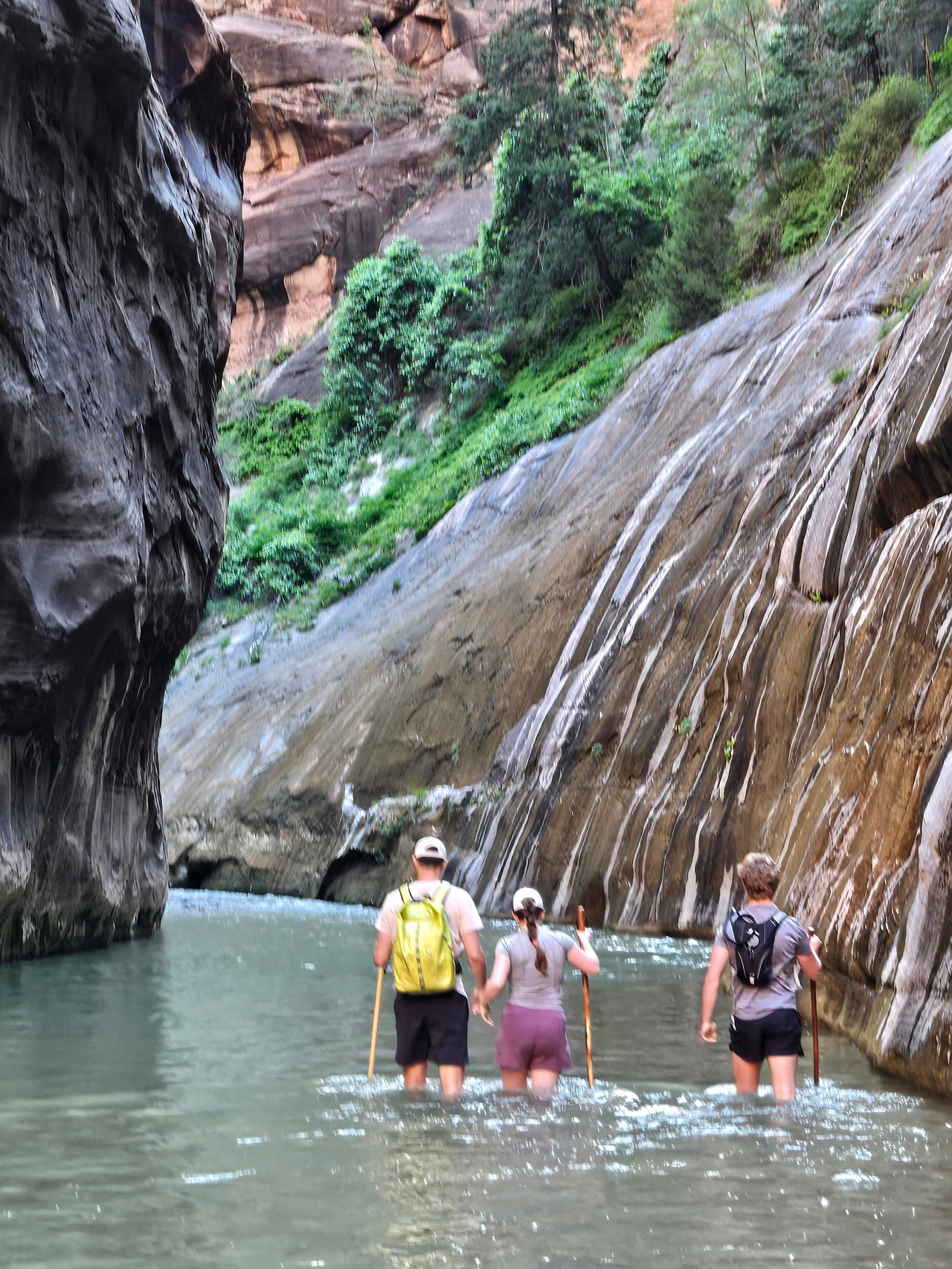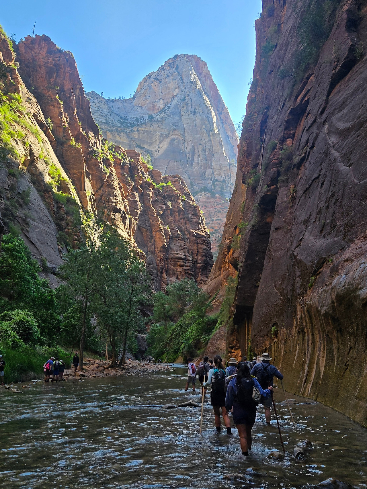 오늘 우리가 타깃한 코스는 '더 내로우즈The Narrows'라는 트레일이다. 자이온 캐년의 가장 좁은 구간으로, 노스 폴킹 버진 강North Fork Virgin River을 따라 수중 산행을 한다. 계곡을 가로질러 1000피트 이상 높이의 사암 협곡 사이를 걷는 독특한 트레일 경험을 할 수 있다. 때때로 수심이 가슴 높이까지 와 사전에 장비도 준비해야 한다.