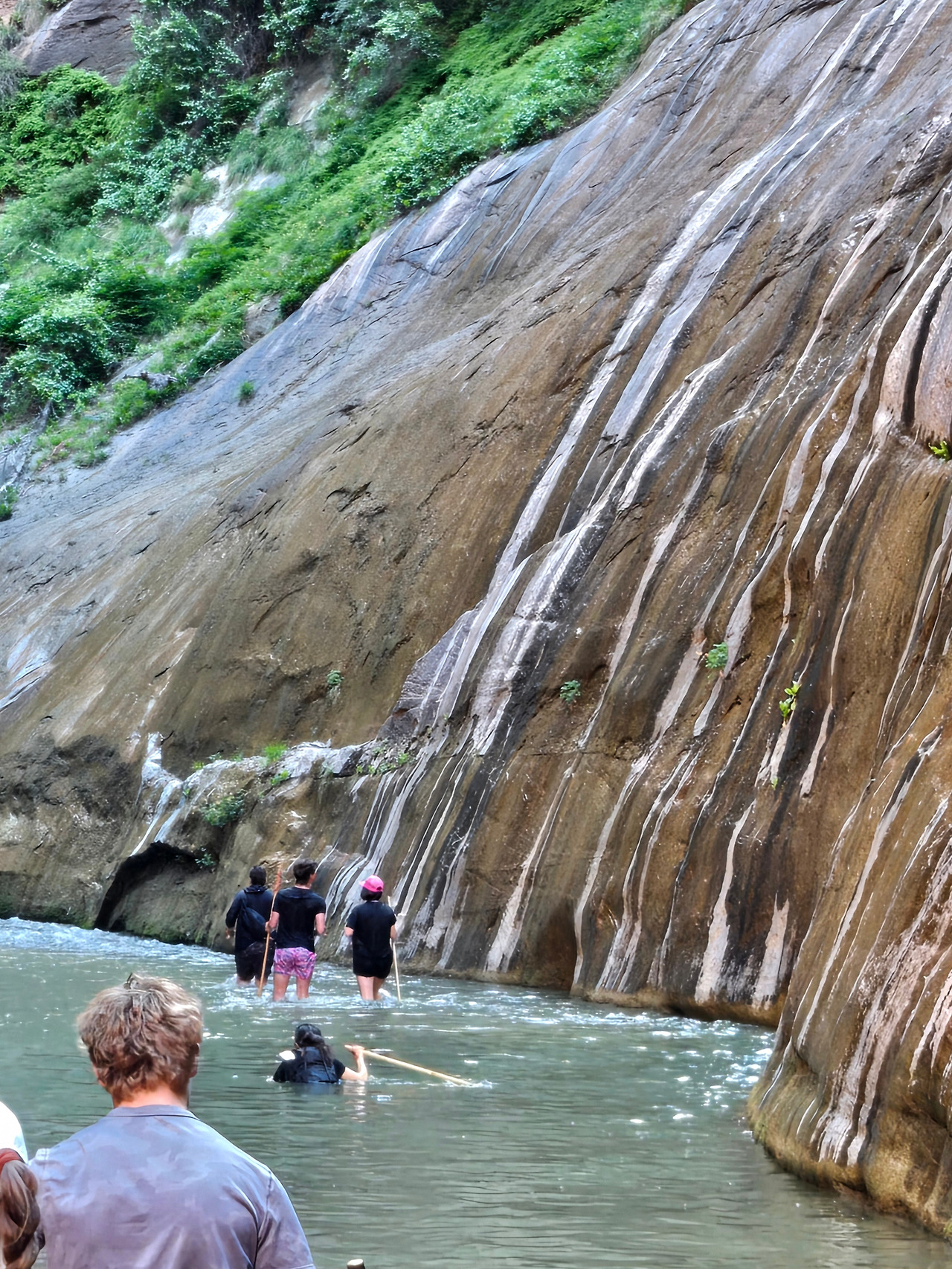 물의 높이가 깊은 곳은 목까지 차오르다 보니 온몸이 젖는 것은 각오해야 한다. 이미 단단히 각오를 한 사람들은 별 망설임 없이 물속으로 뛰어든다. 백팩을 머리 위에 올려 걷는 사람도 있었다. 가장 놀라운 것은 이 깊은 구간을 건너는 아이들이 보호자들의 모습이었다. 초등학교 저학년으로 보이는 아이들은 보호자의 목 위로 올라타거나 등에 업혀 이동했다. 발이 닿지 않을 만큼 깊어 점점 어두워지는 계곡의 색을 보며 겁을 낼 법도한데 부모의 목에 매달려 물아래를 내려다보는 아이들의 얼굴엔 흥분과 설렘이 가득했다. 용기를 내 물길을 건너는 아이들도 대단하지만, 이런 모험을 하도록 격려하고 도와주는 이들의 부모님들이 멋져 보였다.