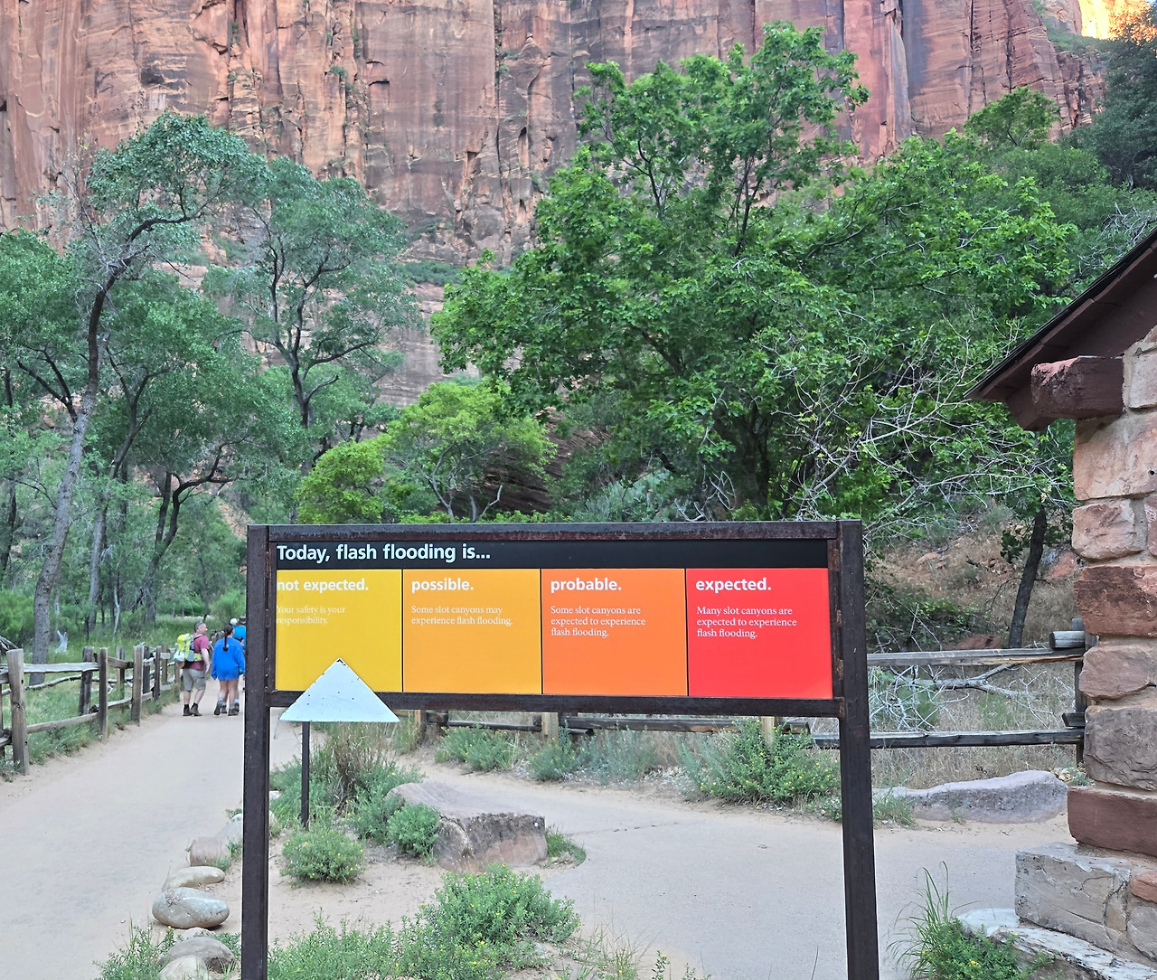 더내로우즈에 가기 전, 주의 깊게 봐야 할 표지판이 있다. 홍수 flash flooding 위험성이다. 이날은 위험도가 가장 낮은 날이라 물 속을 걷기에 적합했지만, possible 단계부터는 주의가 필요하다. 비가 조금이라도 오면 언제든 갑자기 수위가 높아질 수 있고 물살도 순식간에 거세질 수 있어서다.