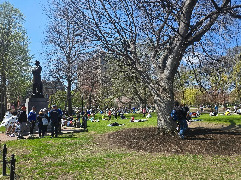 마라톤을 완주한 참가자들이 보스턴 커먼에서 가족, 지인들과 휴식을 취하고 있는 모습