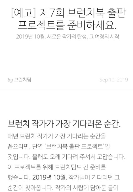 앞서 브런치는 6회에 참가한 10명의 에디터 인터뷰를 브런치북으로 담았다. 내용에는 왜 '이 사람'의 글을 뽑았는지, 당신이 7회에 참가해서 '이 글'이 되려면 어떻게 하면 되는지를 정말 친절하게 설명했다. 내용을 읽고 결론 내린 점은 필력은 필수사항이었고, 우대사항은 결국 기획이었다. 당신의 기획(콘셉트)이 얼마나 괜찮은지를 보여달라는 듯했다.
