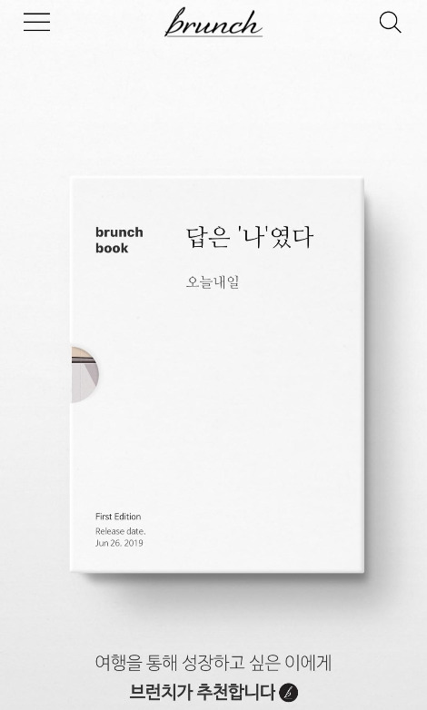 브런치 어플을 열었더니, 메인에는 2019년 2월 브런치 추천 작품으로 선정되었던 <답은 '나'였다> 브런치북이 올라와 있었다. 나의 첫 개인 저서이며, 지금의 길을 걸어가게 해 준 작품이다. 그래서 지금 쓰는 이 글은 바쁘다는 핑계로 오랫동안 브런치에 글을 쓰지 못한 자가 반성을 기반으로 두지만, 게으른 나를 잊지 않고(?) 메인 글에 올려준 브런치에 감사함을 전하고자 함이기도 하다. 그런데 단순히 메인 화면에 올라서만은 아니다. 브런치는 지금의 내 삶에 지대한 영향을 미쳤다.