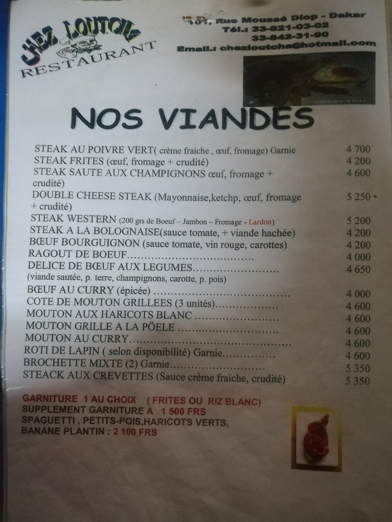 길거리에서 먹을 수 있는 음식들은 *(1) 1,000 cfa 정도에서 가능하나 좌석이 10개 정도 있는 식당에서 음식을 주문하려면 4,000 cfa부터 시작하게 된다. 분명 음식이 그만한 값어치를 하지만 막상 계산서를 받고 나면 확실히 가격이 비싸다는 것을 인지하게 된다.
