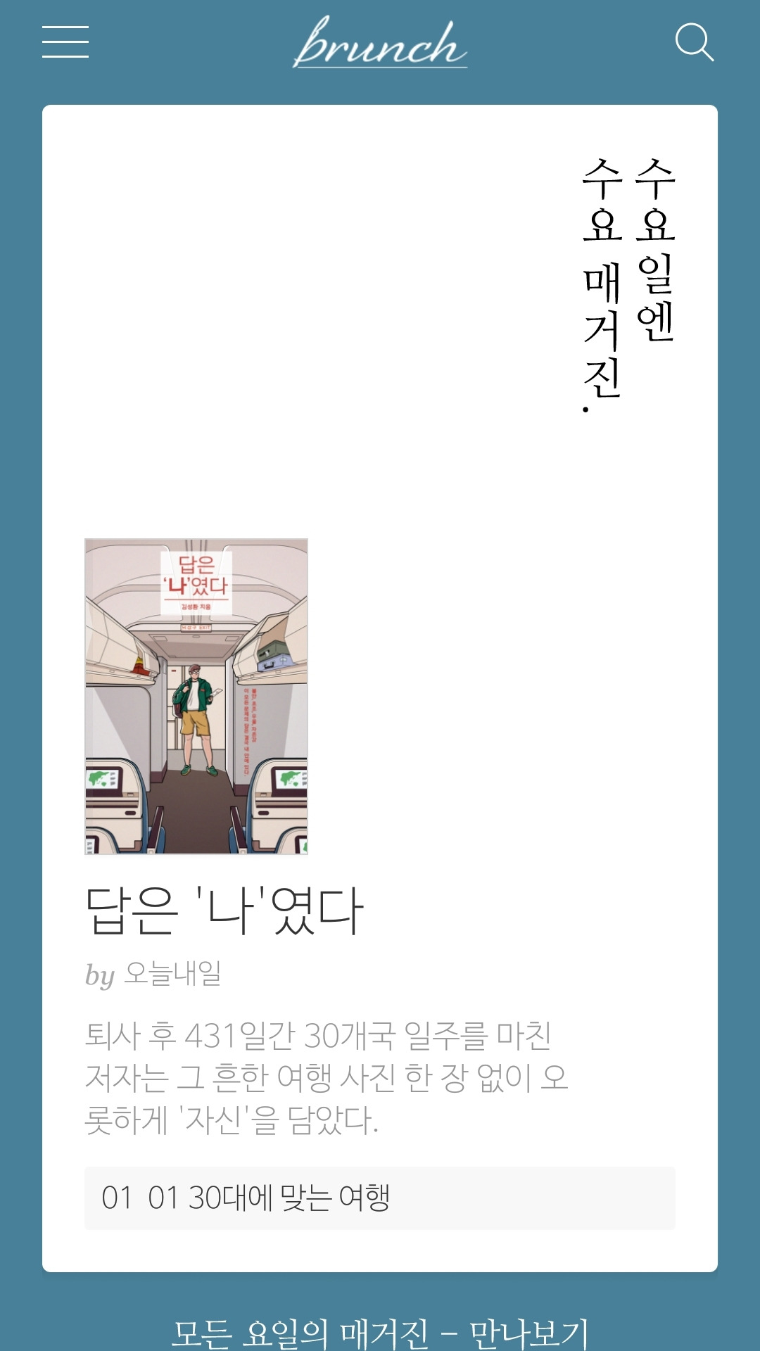 오늘부터 위클리 매거진에 에세이 <답은 '나'였다>가 매주 수요일 연재됩니다.