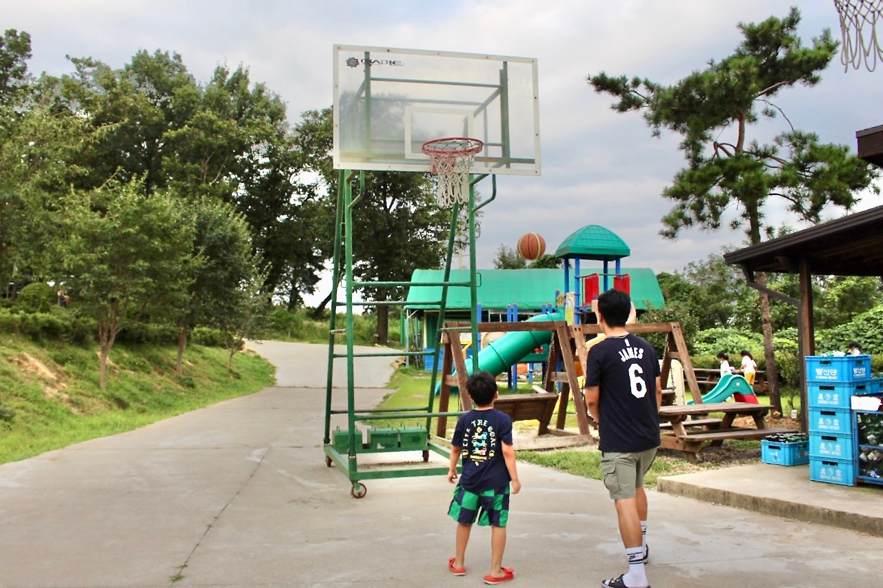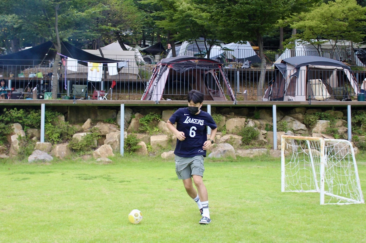 낭만에코파크의 가장 큰 매력은 관리동 앞 잔디운동장이다. 푸릇한 잔디에서 처음 만난 아이들이 같이 공도 차고, 연도 날리고, 뛰어노는 모습은 힐링이 따로 없다.가장 앞 사이트를 쓰면 텐트에 앉아서 내려다보기 좋다. 운동장 아래로는 농구골대, 모래놀이터, 방방장도 있어서, 아들은 언제부턴가 알아서 놀러 가서 찾으러 가야 올 정도로 '손이 가지 않는' 캠핑장이다.