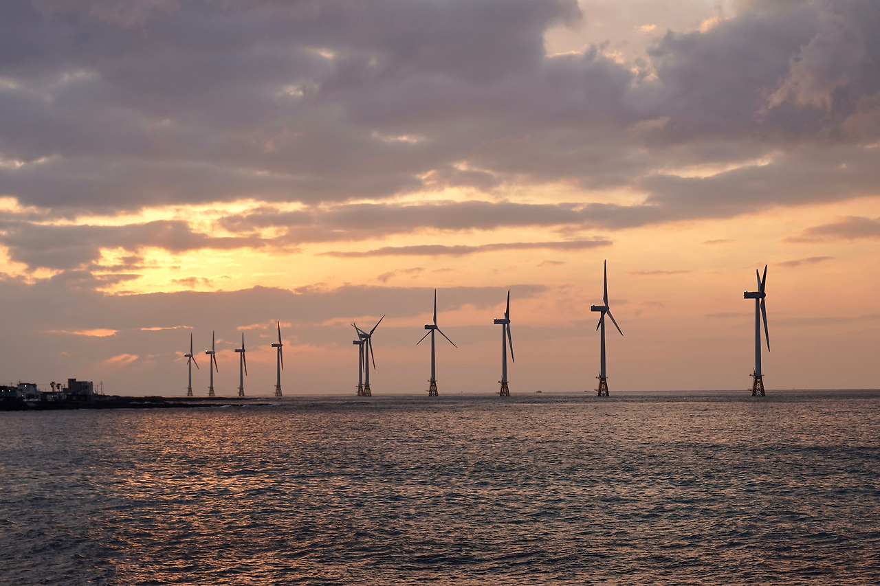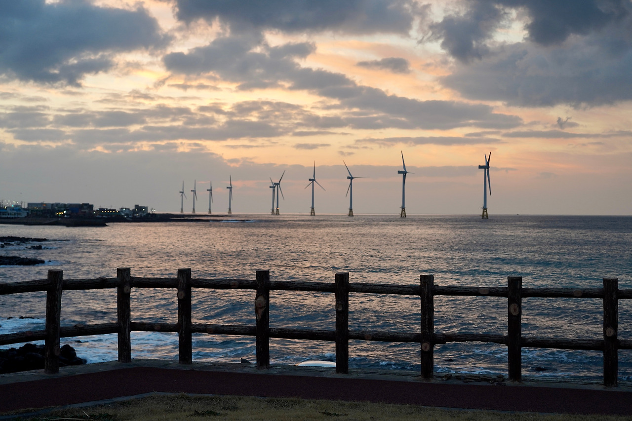 저 멀리 풍력발전기가 돌아가는 바다 끝으로 '어서 와, 제주는 간만이지?' 하는 듯 환상적인 일몰의 분위기를 뿜어냈다. 카페까지 들어갈 것 없이 바로 옆에 작은 공원이 있어서 차를 세워두고 보기 충분했다.