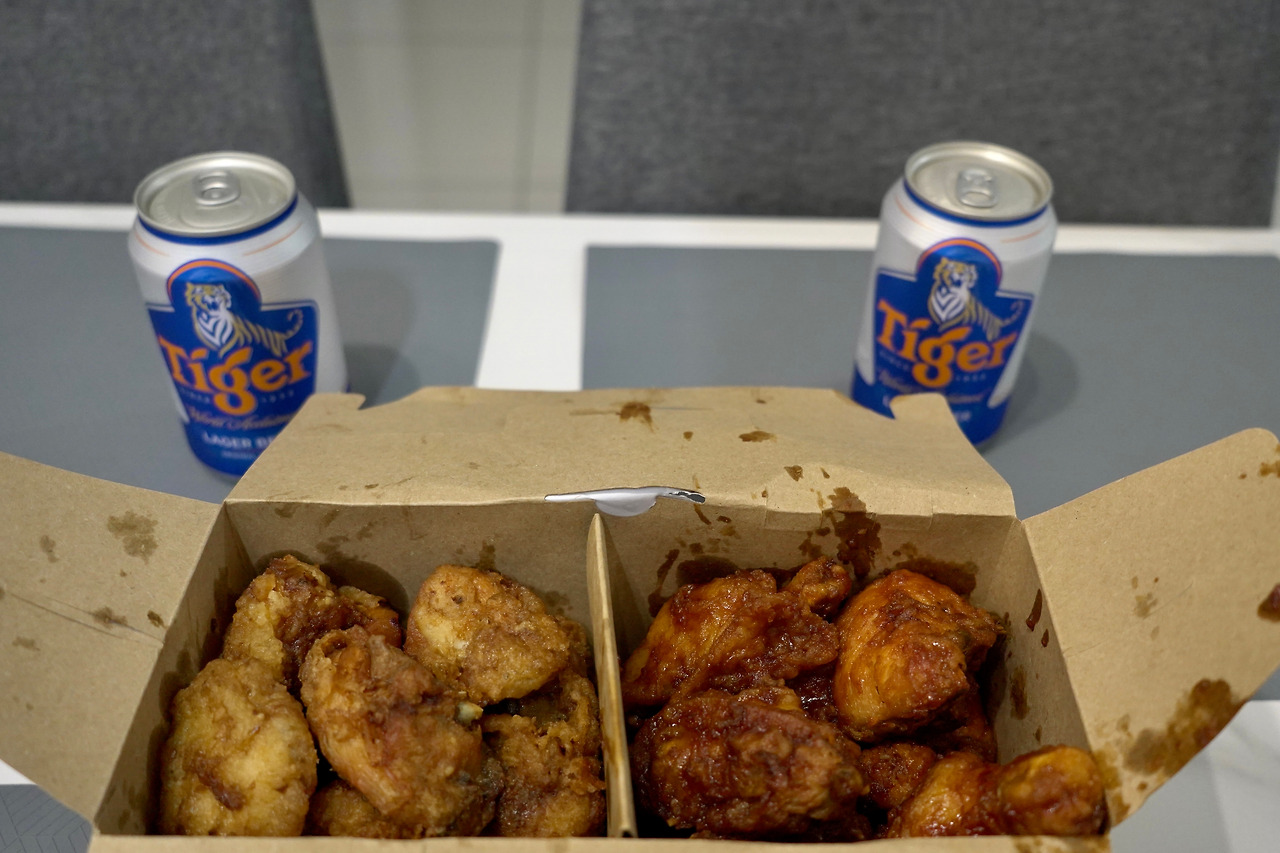 그동안 택시를 부르는 Car 메뉴만 썼는데, 눈여겨보지 않았을 뿐 음식 배달이 가능한 Food, 물건을 주문해 실시간으로 받을 수 있는 Shopping, Grocery, Mart까지 사용범위가 꽤 컸다. 안 그래도 아들은 숙소 야외 풀에서 수영할 날만 기다리고 있었는데 희소식. 아들과 난 바로 풀에 뛰어들었고, 아내는 느긋하게 앉아 배달음식을 골랐다. 선택지는 가까운 마이타운몰에 최근 오픈했다는 무려 교촌치킨. 맛도 거의 비슷했다.