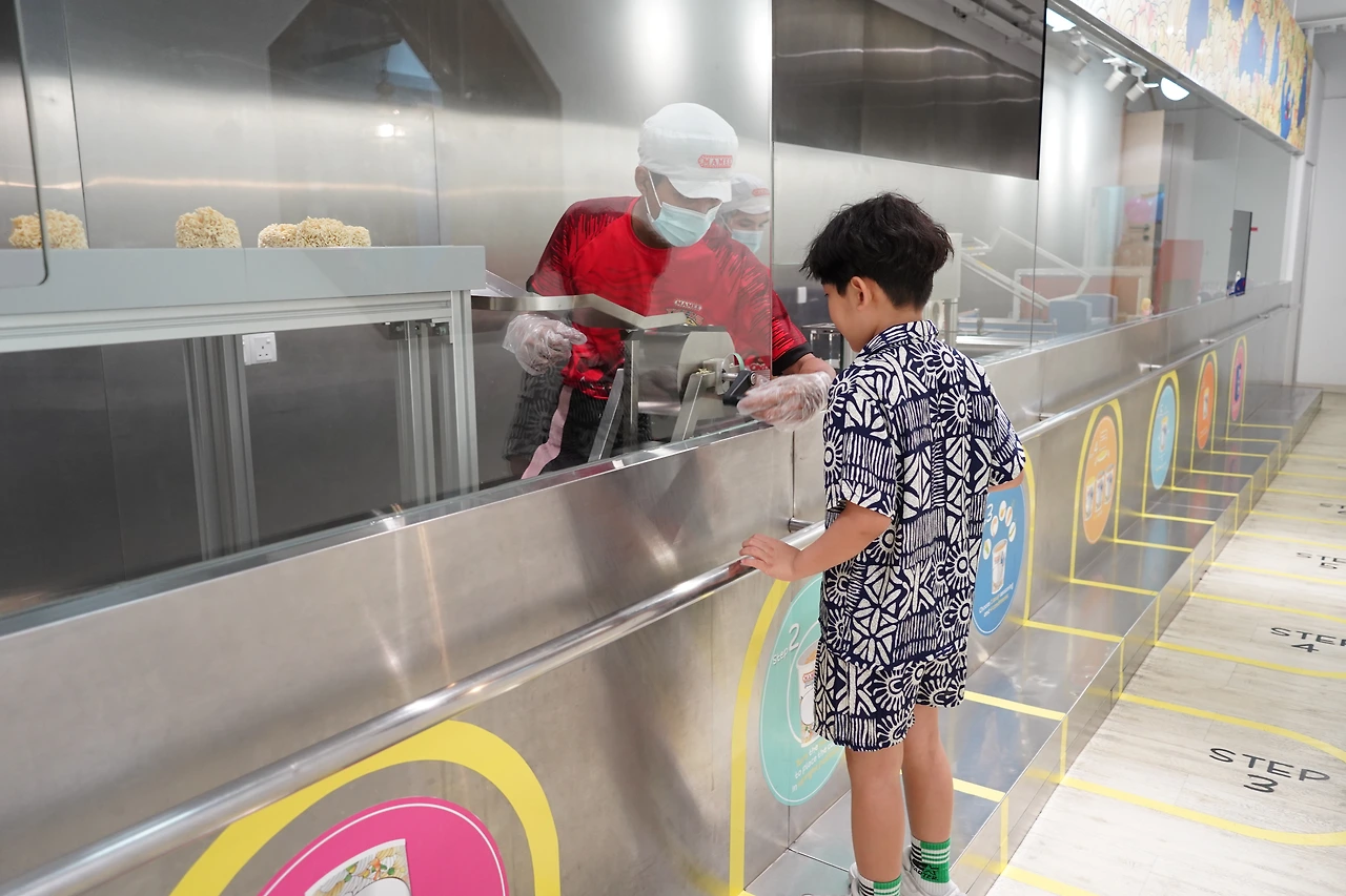 국내 키자니아 오뚜기 체험관에서도 비슷한 컵라면 제작 공정을 배우고 만들기 체험을 하지만 마지막 순간 뒤에서 슬쩍 기성품을 벤딩머신에 넣어둔다. 하지만 여긴 진짜 건더기 스프를 골라 넣고 뚜껑을 압착하고 비닐을 씌운다. 게다가 캐릭터 박스까지 담아주다니- 아들은 캐릭터 박스를 내내 목에 걸고 다녔다.