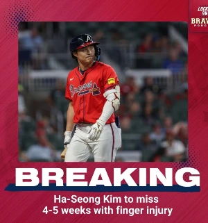 김하성(ATL) 손가락 힘줄 파열로 4~5개월 결장 예상