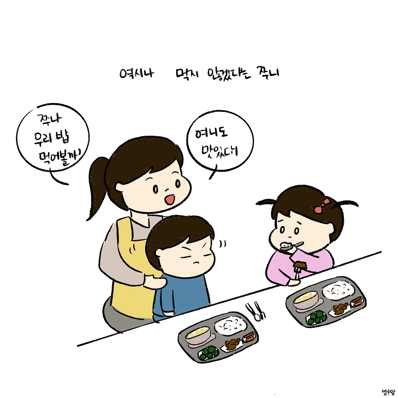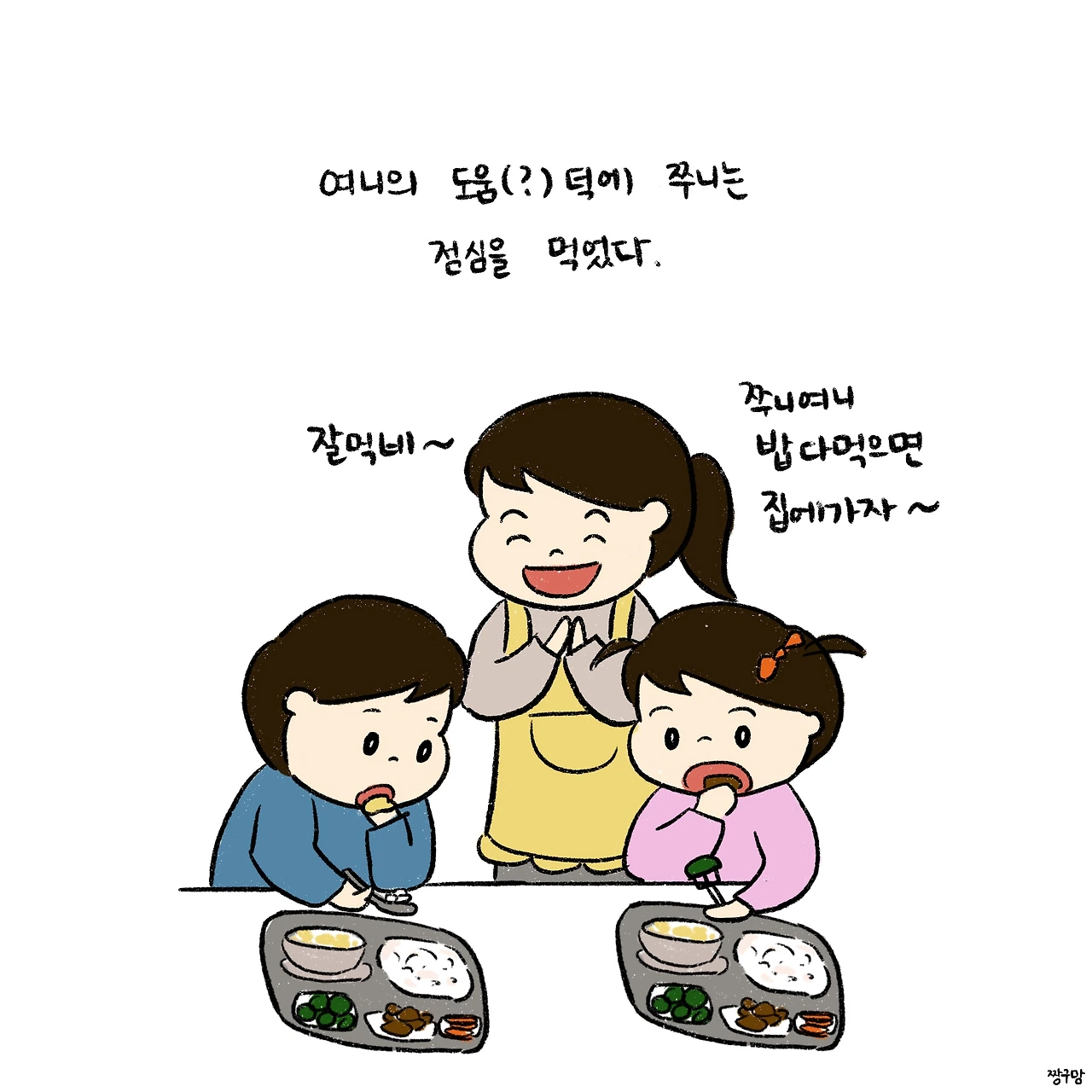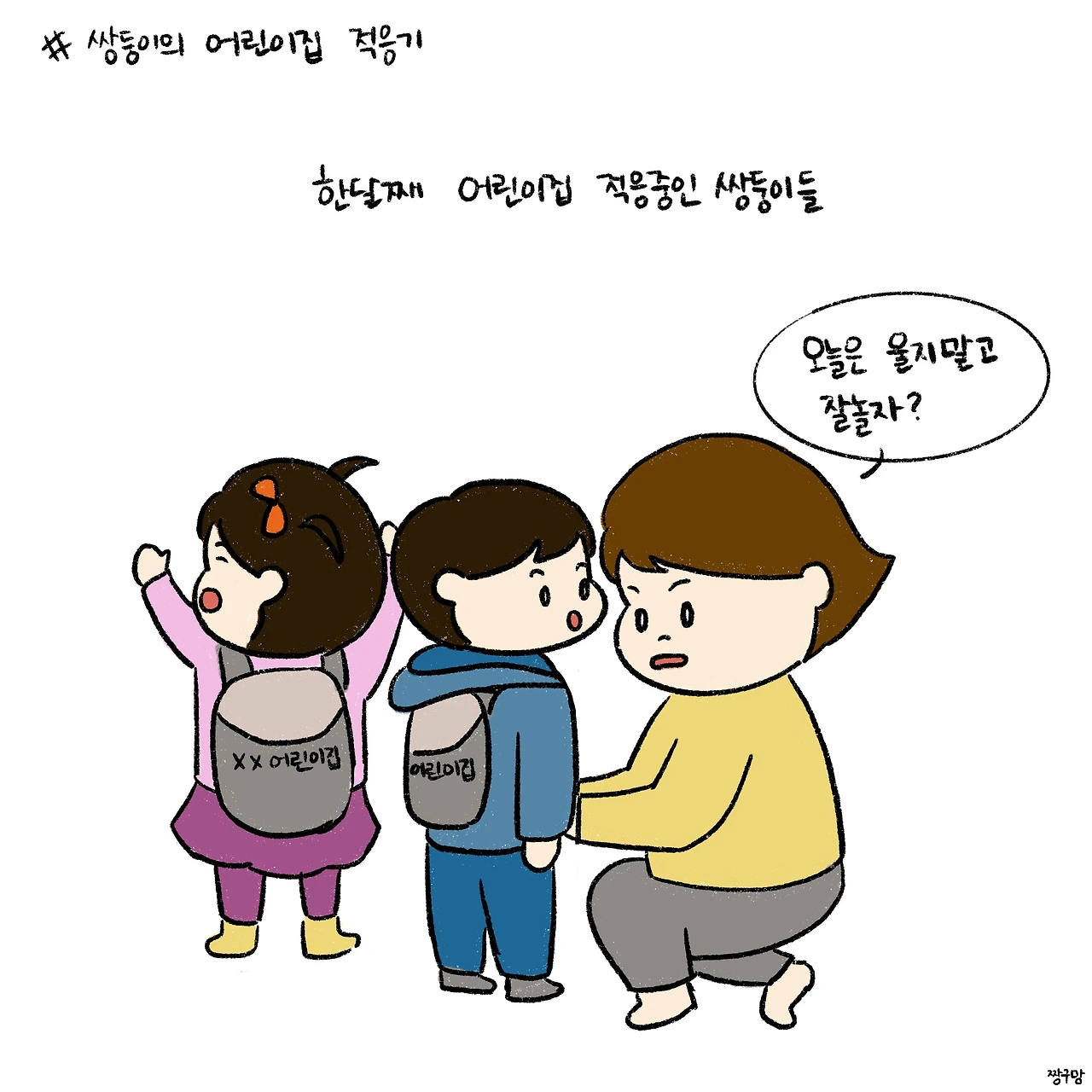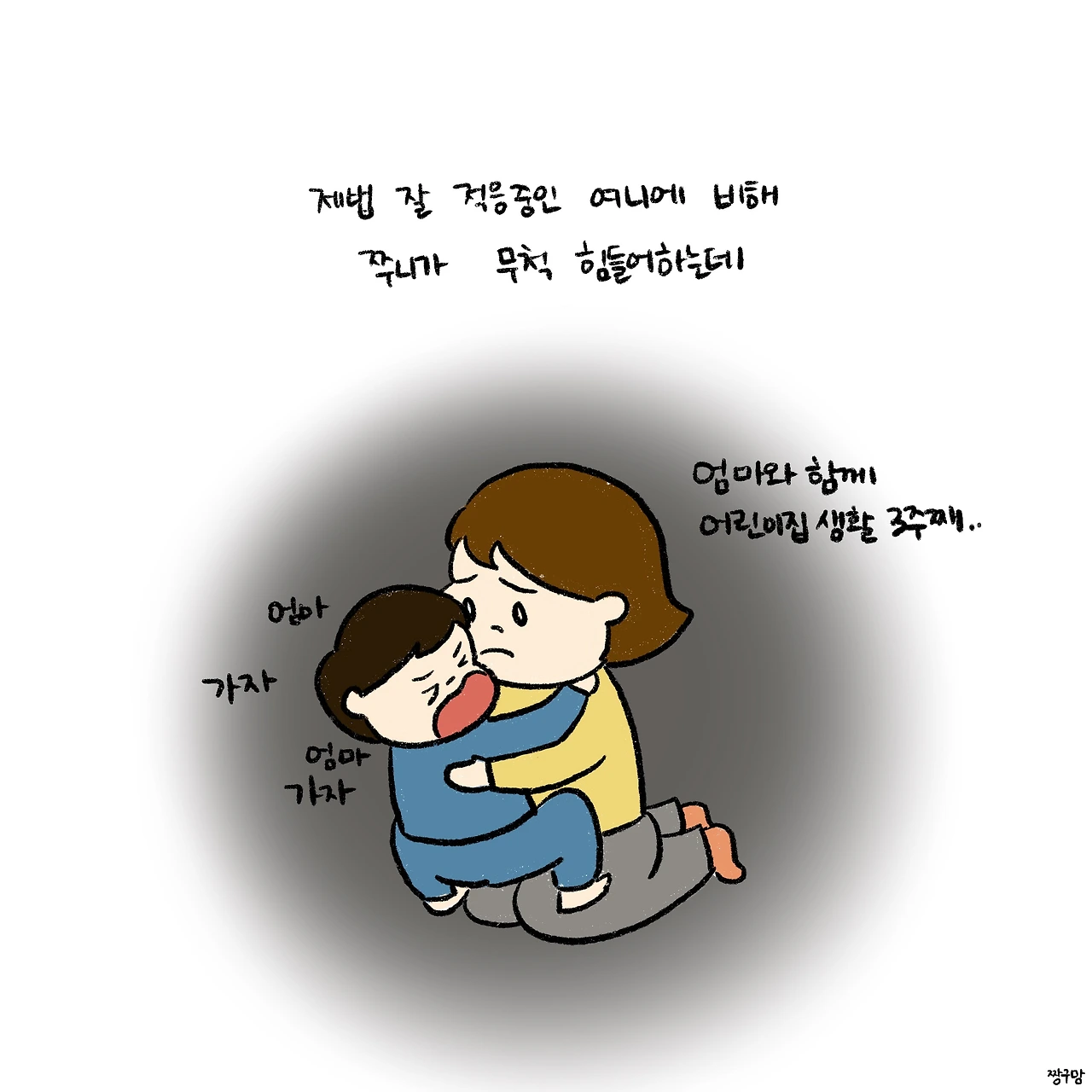 초반 적응에 힘들어하던 쭈니를 달래며 장난감이나 간식을 챙겨주던 여니. 정말 안될것 같았는데 여니 덕분인지 우리쭈니 갑자기 적응! 요즘은 쭈니는 씩씩하게 인사하며 등원하고 여니가 웁니다... 아직 점심먹고 하원..그마저도 안먹을때도갈길이 먼 얼집 적응의 길...