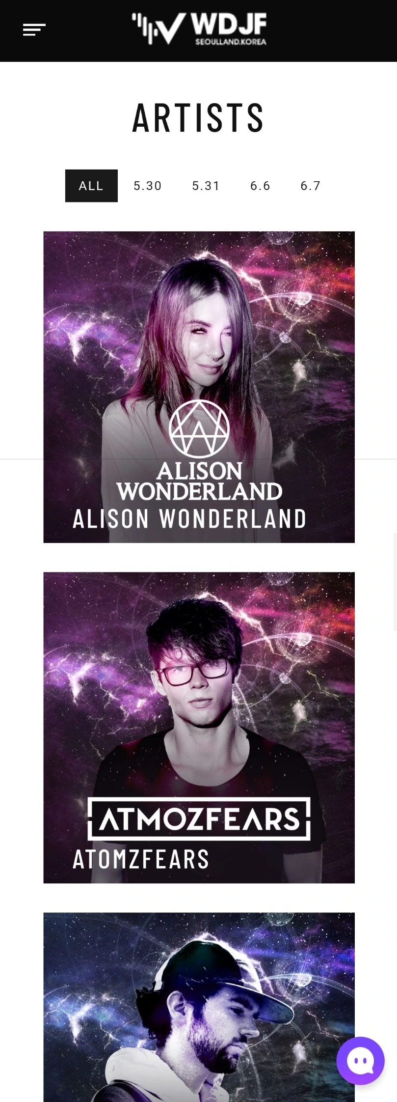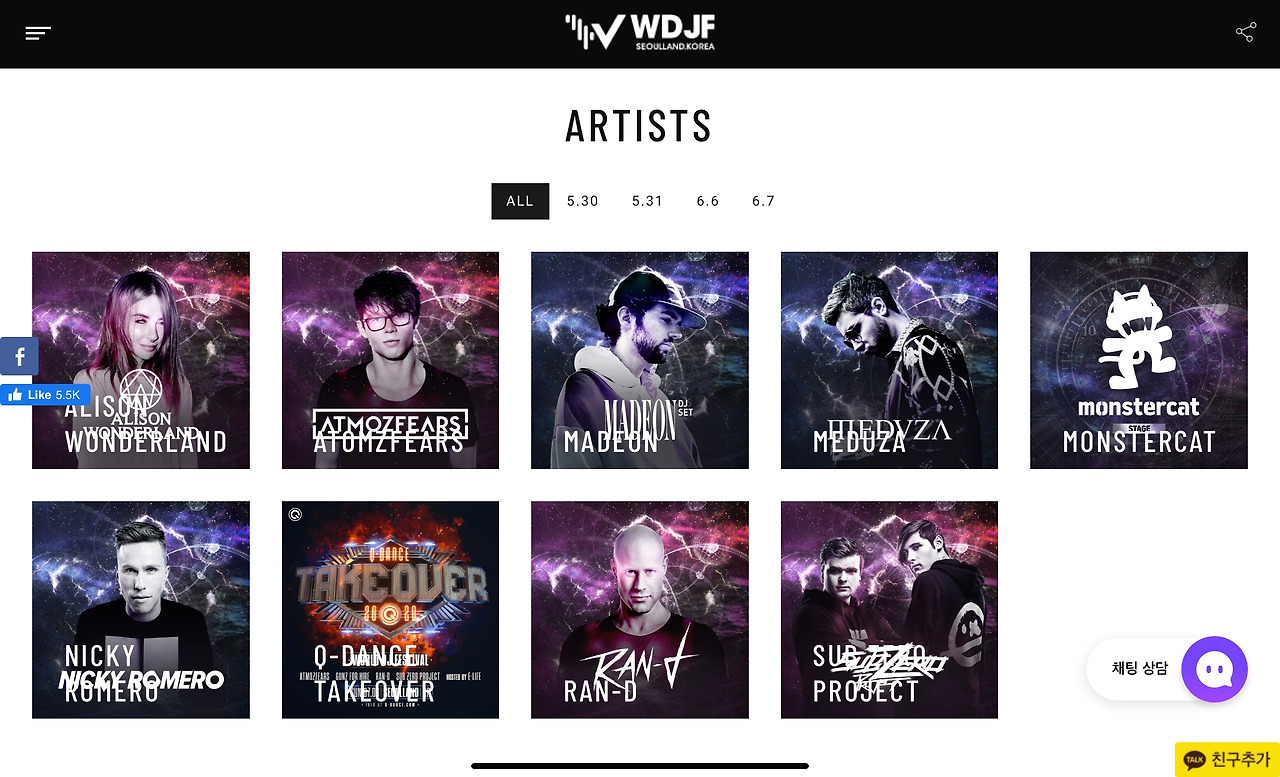 라인업 소개 탭. 홈에서 스크롤을 살짝 내리면 나오는 화면이다. 왼쪽은 pc/태블릿. 오른쪽은 모바일. 월디페 웹페이지의 변화 중 가장 인상적이었던 점은 첫 화면에서 조금 아래로 스크롤을 내리면 나타나는 라인업 소개 화면이다. 아직 Alison Wonderland, Medvza, Monstercat, Q-Dance, Madeon 등 극히 일부의 라인업만 공개된 상태. (물론 극히 일부이지만 그자체로 엄청난 라인업!)