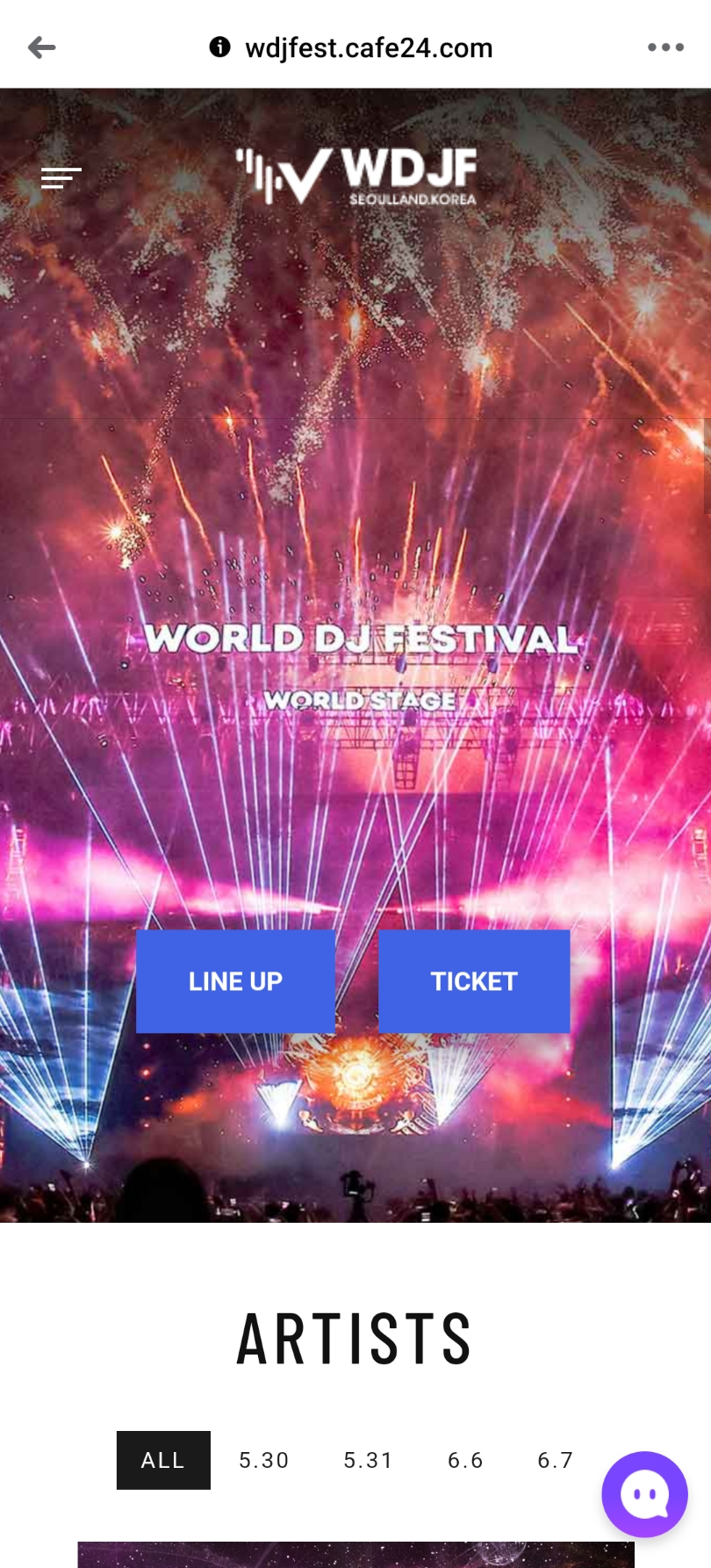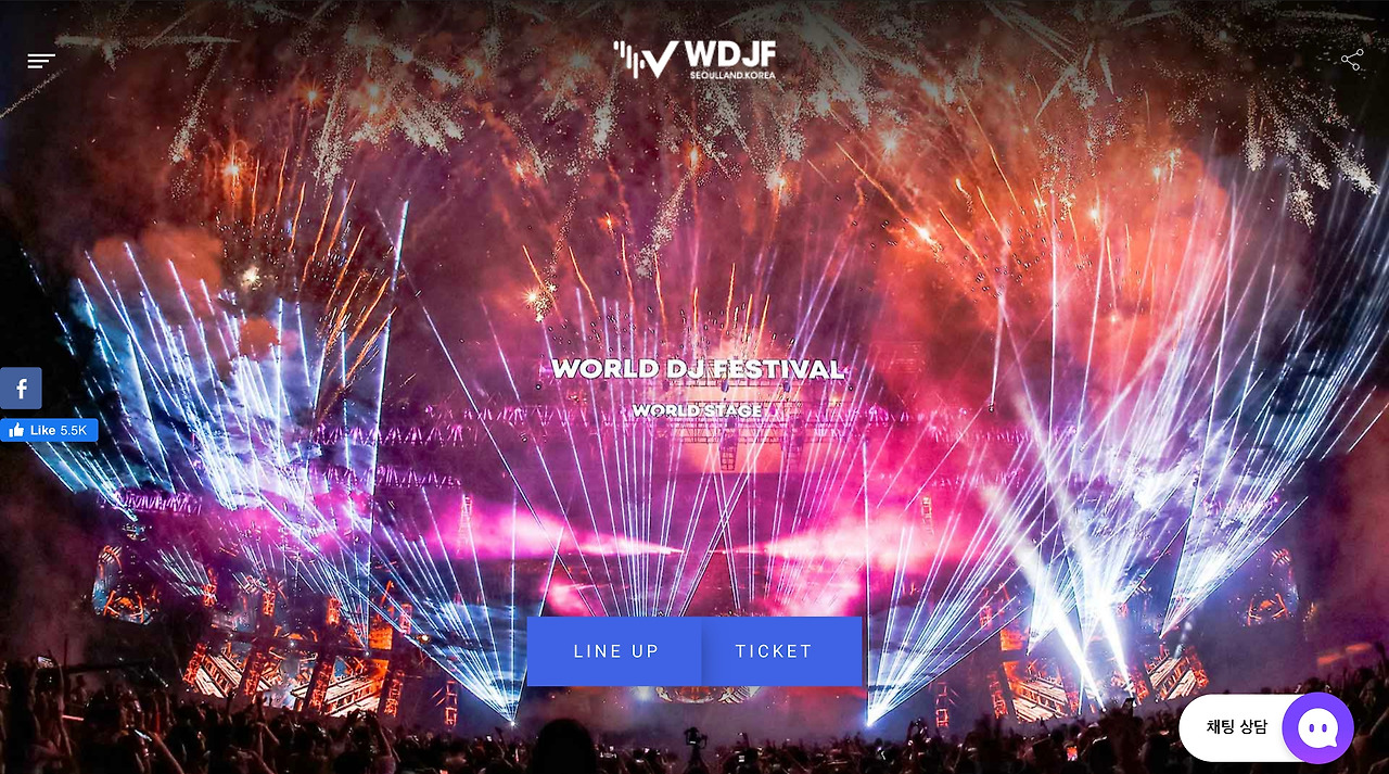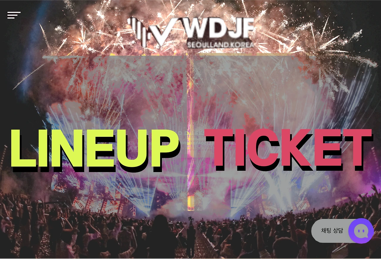 월디페 웹 페이지의 모바일 기기 화면과 pc/태블릿 화면 첫 페이지에 들어가면, World DJ Festival(WDJF) 라는 큰 타이틀 로고와 함께 Lineup과 Ticket이라는 파란 컨트롤 버튼이 보인다.