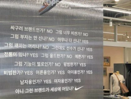 피드백을 통해 잘못된 정보를 정정합니다. 이 이미지는 나이키의 광고가 아닌 STROL MD 여준영님의 매장 DP 사진이라고 합니다. 나이키의 임팩트를 나타내는 말임에는 맥락상 부합하여 타이틀을 고치지는 않았으나, 나이키 측에서 적은 것이 아닌, 해당 매장에서 기획한 카피라는 점 정정합니다.