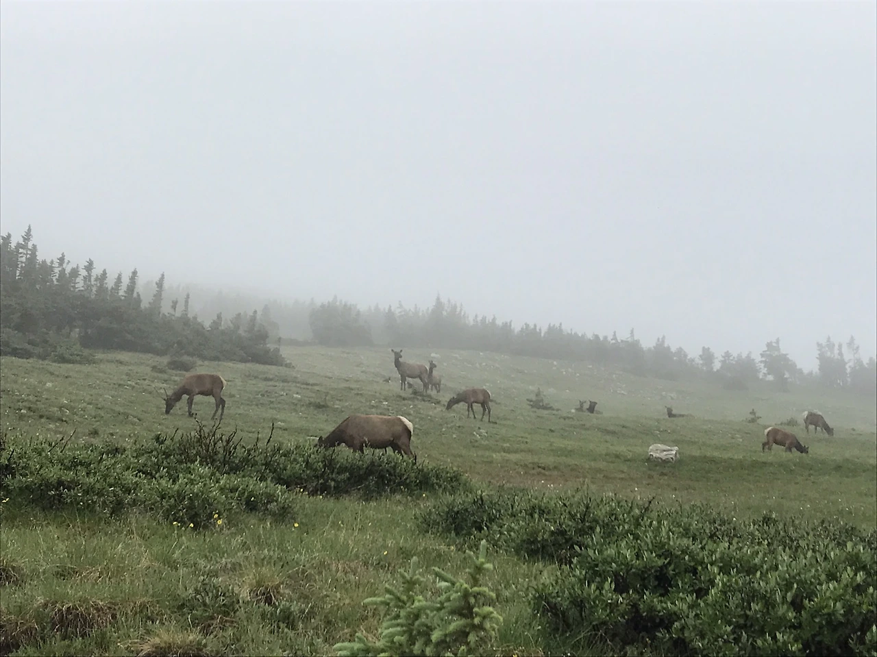 드디어, 로키에 들어왔다. 이상하게 길 한 곳에 차들이 주차되어 있고 대포카메라를 든 사람들이 줄지어 있다. 본능적으로 나도 내렸고, 사람들이 모여 있는 이유를 알게 된다. 약간의 안개와 산 특유의 고요함, 사람들은 동물들을 구경하고 나는 그 둘을 구경하고. 동화 같았다.