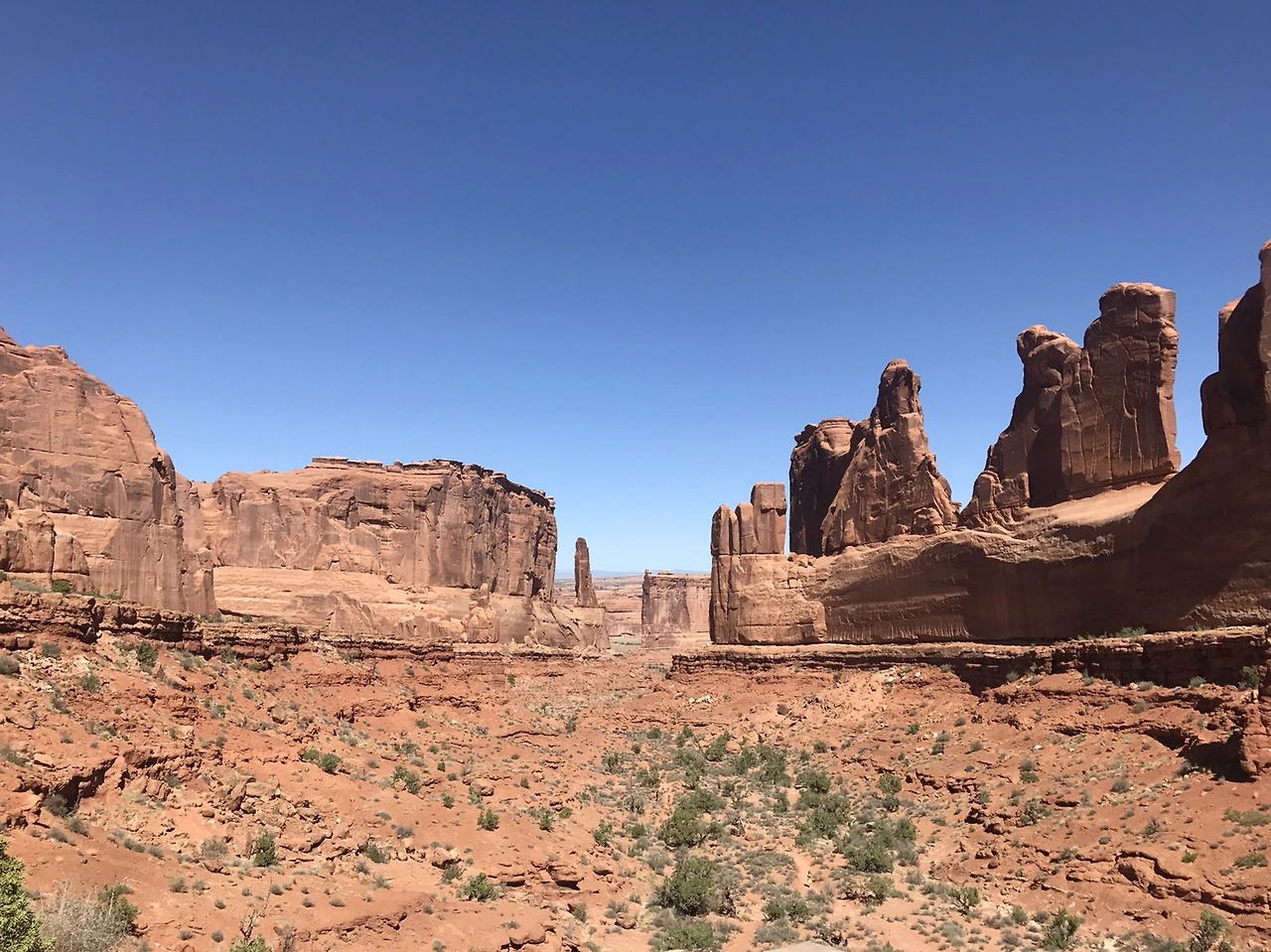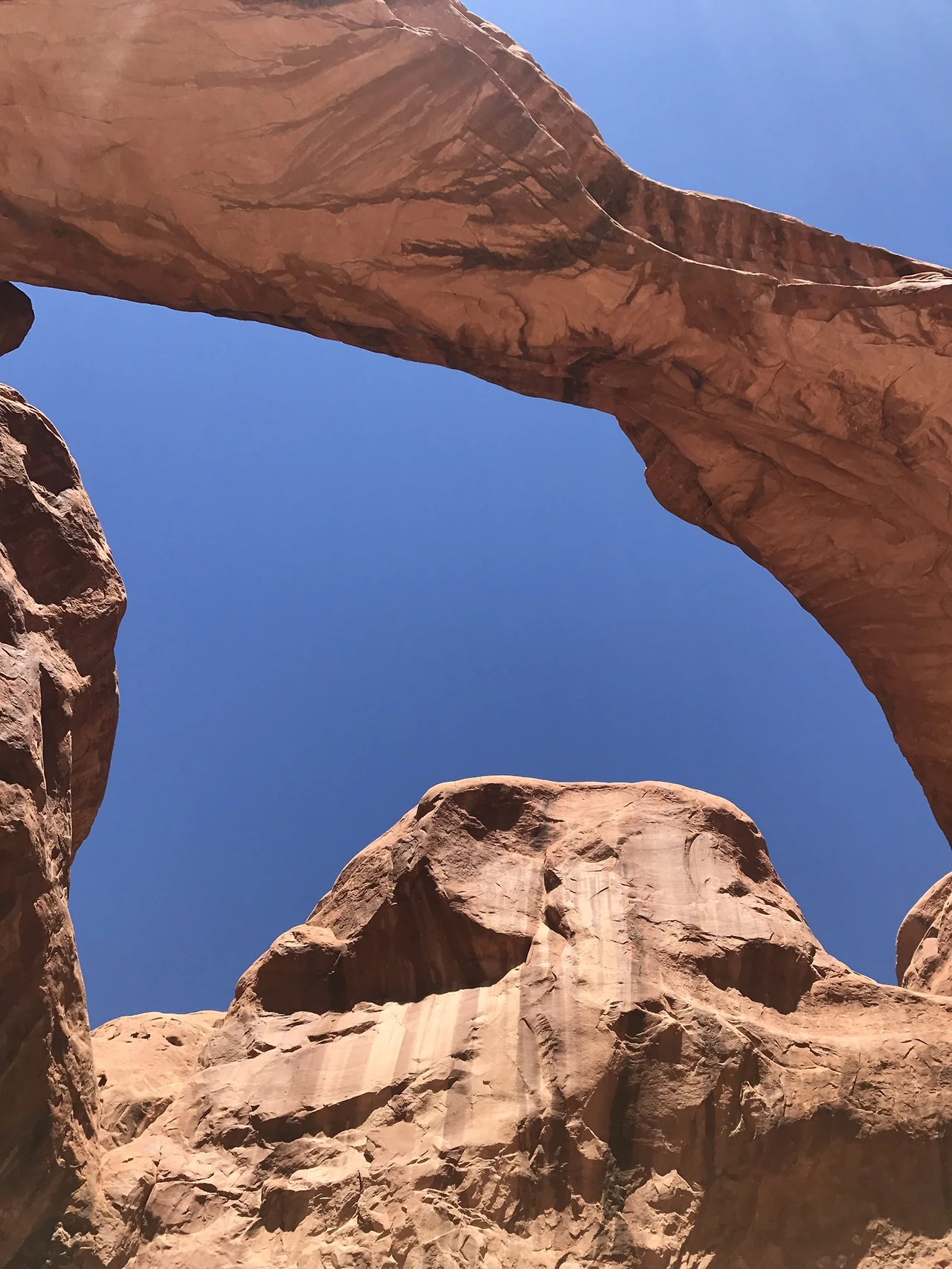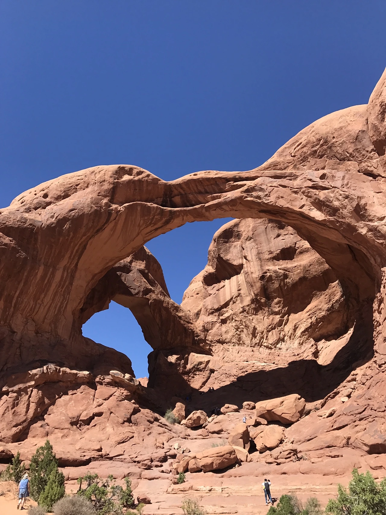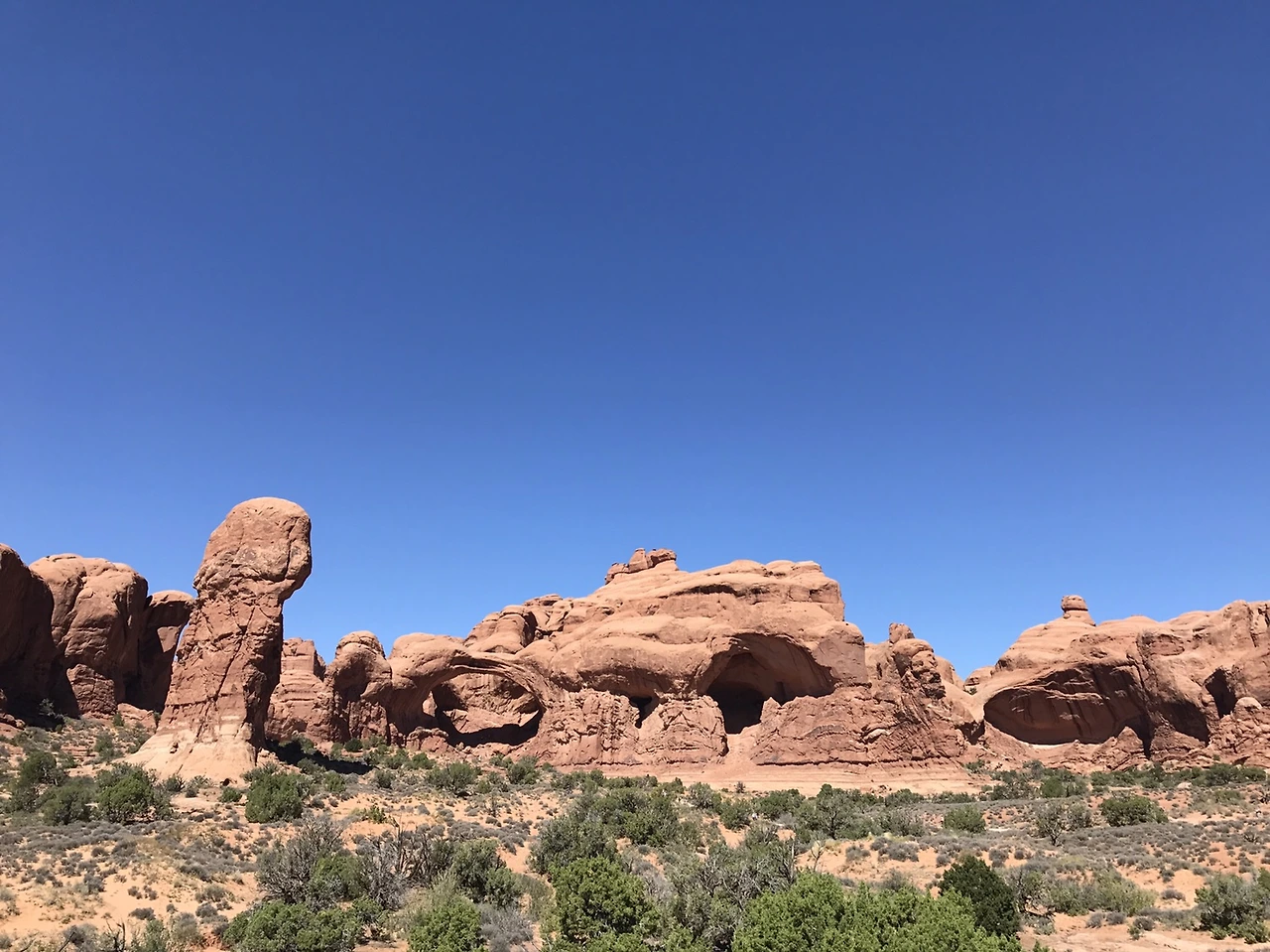 멀리 보이는 아치들. 아치스국립공원에는 이삼천 개 정도의 아치가 있는데 그 아치들은 부러질 때까지의 수명이 있다고 한다. 그중 수명이 얼마 남지 않은 아치들은 수십 년~수백 년 안에 무너질 것이라고 어디에서 본 것 같다. 내가 죽는 것이 문제가 아니라 저 아치들이 무너지기 전에 가야 한다. 저 멀리서도 존재감 확실한 더블아치.