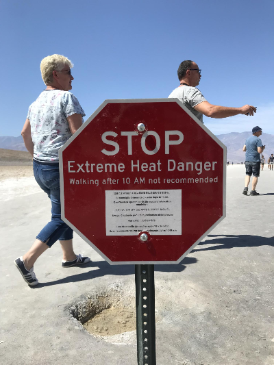 배드워터, 미국에서 가장 지대가 낮다는 이곳, 들어가는 입구에 Extream heat danger 경고가 있다. 무려 오전 10시 이후에 걷는 것은 권고하지 않는다고. 오전 10시가 약간 지났을 무렵인데도 모자 없이 이동하는 것이 힘들 정도다.