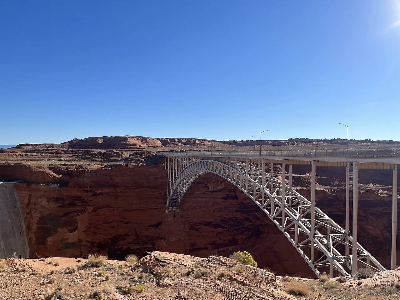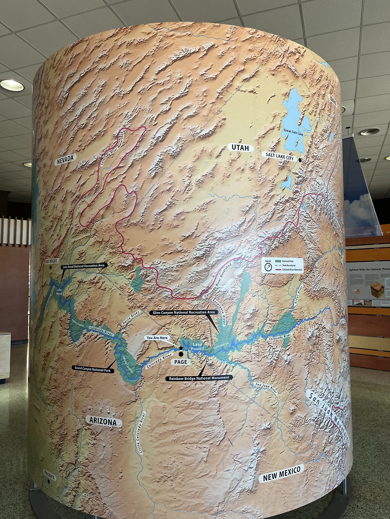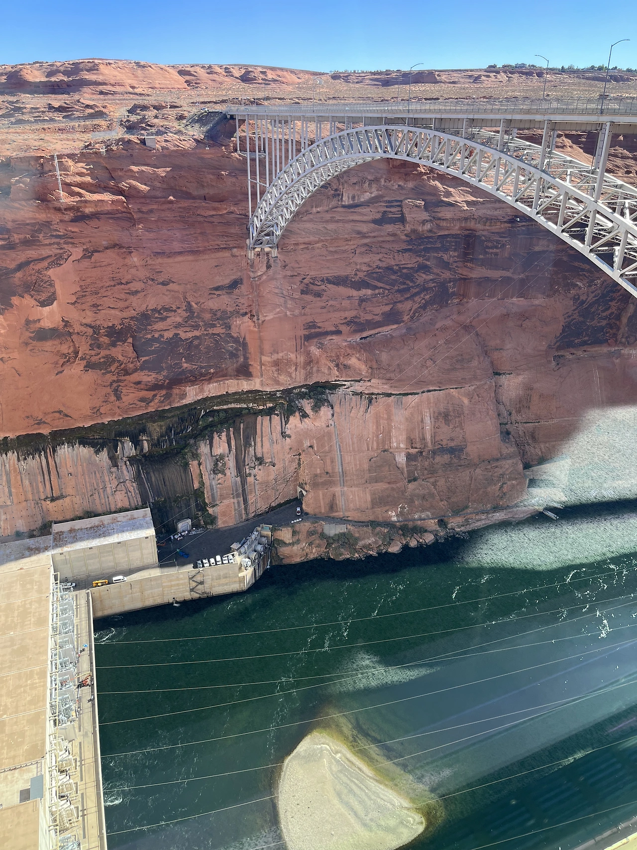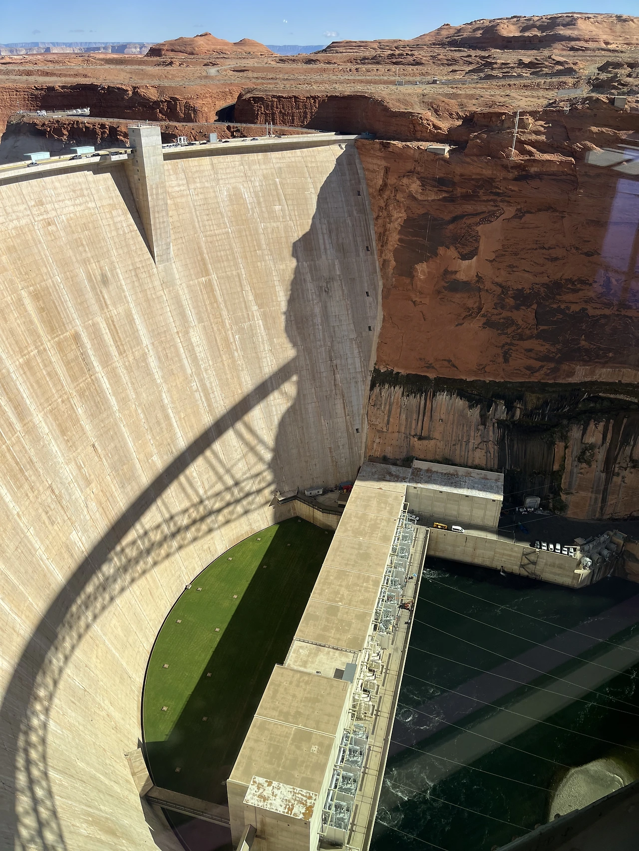 사실 꼭 페이지에 와야 했던 이유는 엔텔롭 캐니언 투어를 예약했기 때문인데, 이 페이지에는 엔텔롭 캐니언만 있는 것이 아니다. 국문으로는 글렌캐니언 국립 휴양지이고, 흔히 글렌캐니언 댐으로 많이 알려진 곳이다. 이 글렌 캐니언 댐은 어디서도 볼 수 없는 자연친화적(?) 인공미를 갖춘 곳이다. Carl Hayden visitor center 앞에는 나처럼 들뜬 사람들이 입장을 위해 줄을 서고 있었다. Visitor center 안쪽으로 들어가니 날 것 그대로의 모습을 볼 수 있었는데 한마디로 쩍 소리가 나는 전경이다.