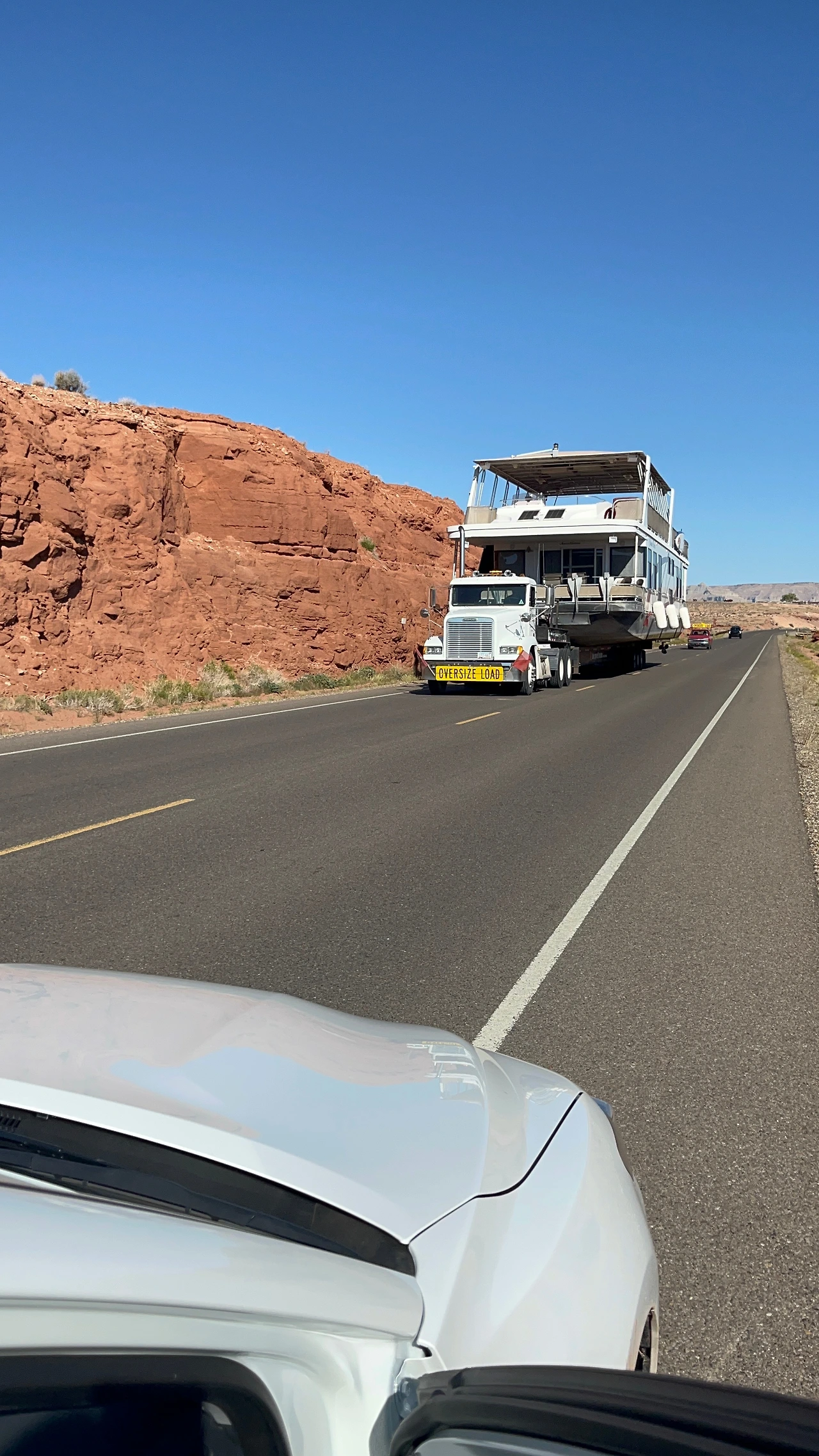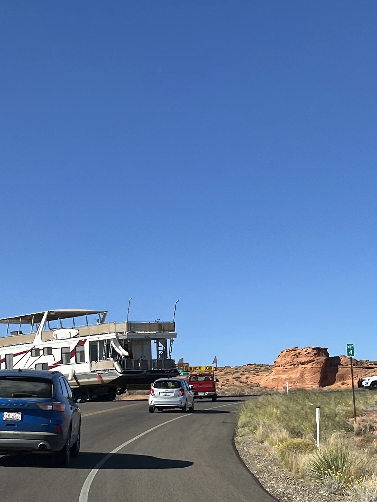 그리고 더 북쪽으로 올라가던 도중 정말 신기한 광경을 목격했다. 시카고강에서 볼 법한 크루즈 요트를 실은 트럭이 전면에 경찰의 에스코트를 받으며 "OVERSIZE LOAD" 표시를 한채 가는 것이다. 레이크 파월에서나 볼 수 있는 귀한 장면이다.