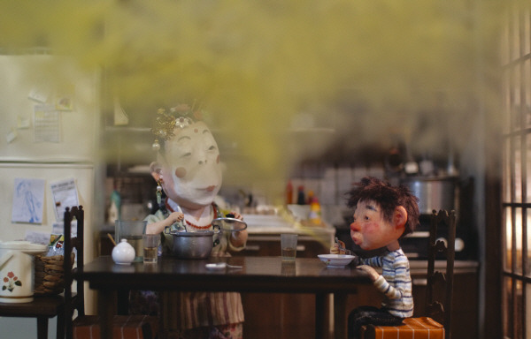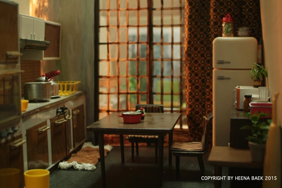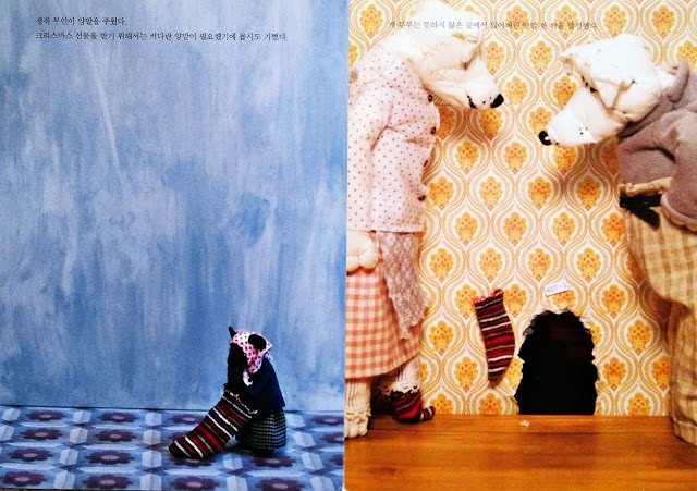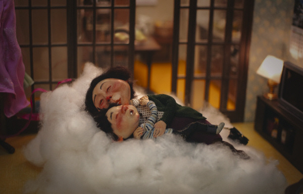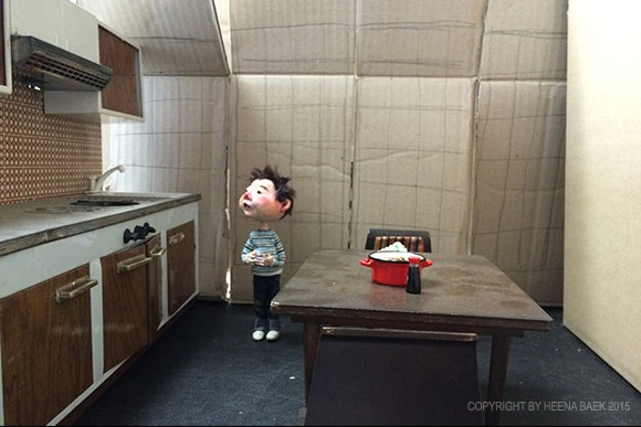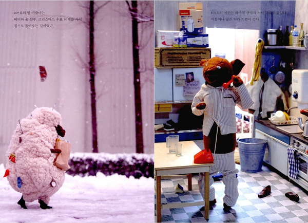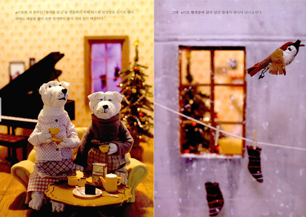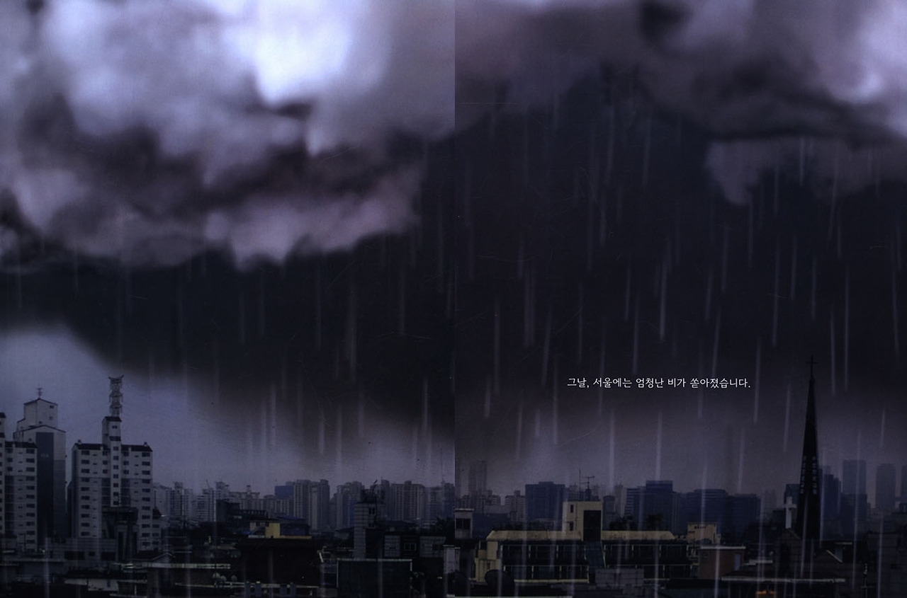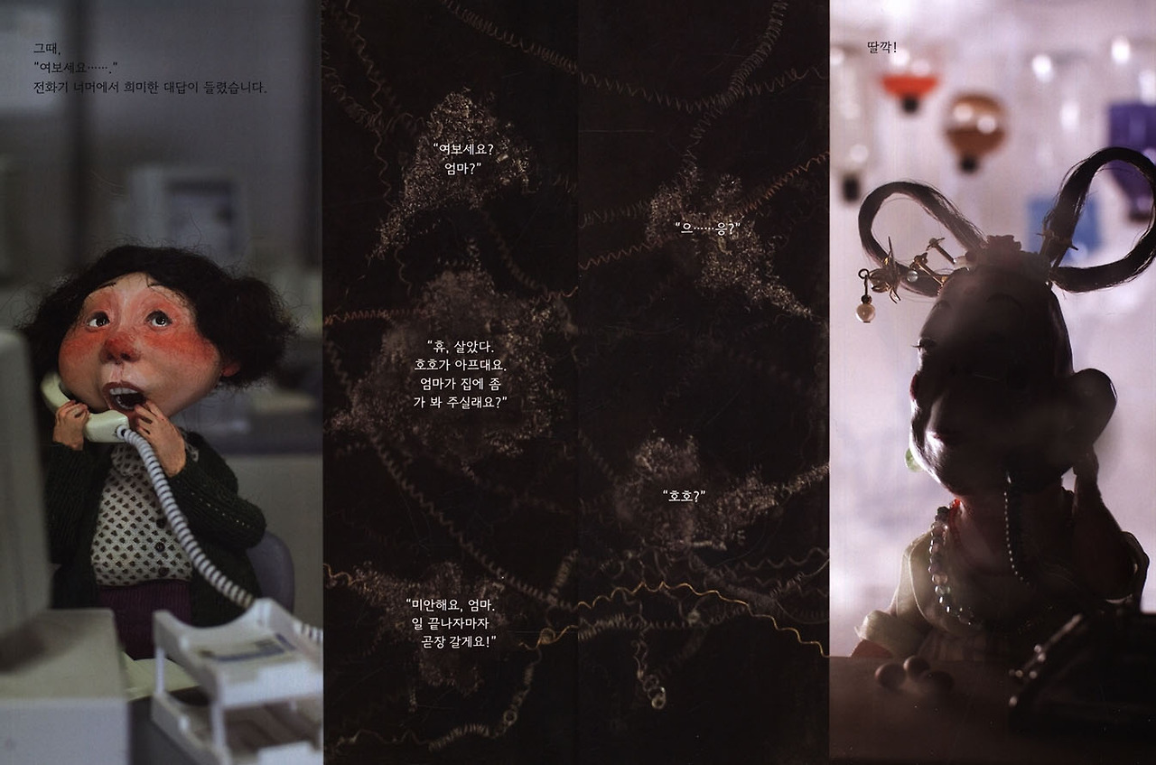 그림책보다는 스톱모션 애니메이션에 더 가까워 보이는 제작과정도 매력적이다. 세차게 쏟아지는 빗줄기와 방 안 가득한 안개는 아크릴판을 사용해 표현했고, 웃는 듯 아닌 듯 묘한 선녀의 얼굴은 조선 후기의 얼굴상을 바탕으로 제작되었다. 또, 엄마의 퇴근길 풍경은 작가가 어린 시절을 보냈던 망원동으로, A3 용지에 프린트한 사진을 삽입한 것이다. 무엇보다 소품의 배치나 조명의 각도, 카메라 촬영도 모두 작가가 맡아서 했다. 각도와 빛에 따라 인형의 표정과 느낌이 매번 달라지기 때문이다. 이야기가 더 진짜처럼 느껴지는 건 이렇게 인형들과 끊임없이 소통해서인지도 모른다.
