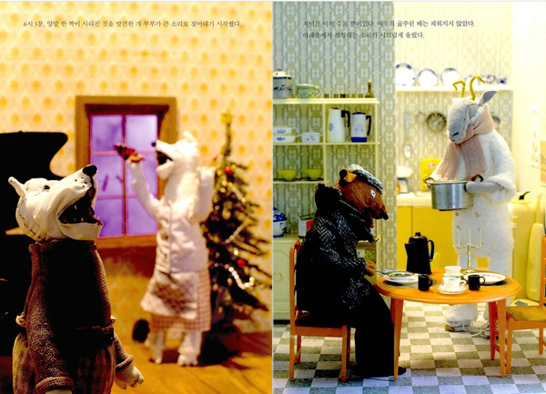 그런가 하면 <어제 저녁>은 페이지를 잡아당기면 병풍처럼 와르르 펼쳐지는 형식에 이야기 구성 방식도 독특한 작품이다. ‘유쾌한 아파트’에는 총 아홉 가구가 산다. 마음이 약해 늘 굶주리는 사냥꾼 여우, 저녁마다 노래를 부르는 개 부부, 꼬불꼬불한 털이 잔뜩 엉킨 양……. 개 부부의 양말이 사라진 어느 날 저녁 6시, 옆집에서는 이틀이나 굶은 여우가 산양에게 저녁 초대를 받고 오리 유모는 아기 토끼 여덟 마리를 재우고 있다. 물건 수집이 취미인 생쥐는 크리스마스 장식을 구하러 외출하고, 아파트 밖에서는 고양이가 케이크를 배달하러 오는 중이다. 각기 다르게 펼쳐지던 아홉 개의 일상은 개 부부가 울부짖으며 차례차례 연결된다.