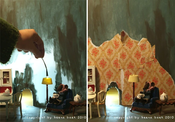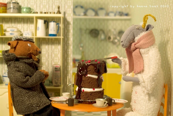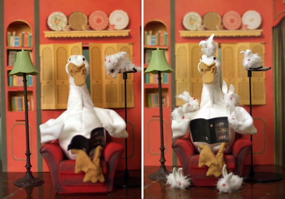 이 작품 역시 언뜻 보고 넘어가기 쉬운 장면 하나에도 엄청난 정성이 녹아 있다. 인형이 고개를 기울이는 각도부터 벽지의 종류, 스탠드의 위치, 인형이 입고 있는 옷, 사진의 각도 등 모든 요소들이 수백 번의 테스트를 거쳐 결정된다. 앙증맞은 소품들도 마찬가지다. 아기 토끼들의 8층 침대는 비누갑 여덟 개를 하나하나 개조해 만들었고, 손가락 두 마디만한 크기의 초콜릿 머드 케이크도 실제로 반죽해 구웠다, 오리 유모가 아기 토끼들에게 읽어주는 그림책이 작가의 다른 작품인 <달 샤베트>라는 설정도 사랑스럽다.