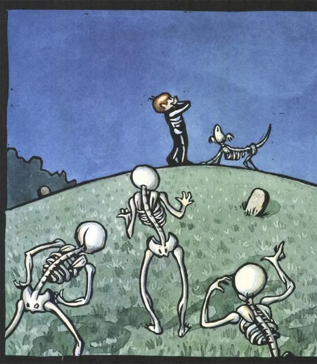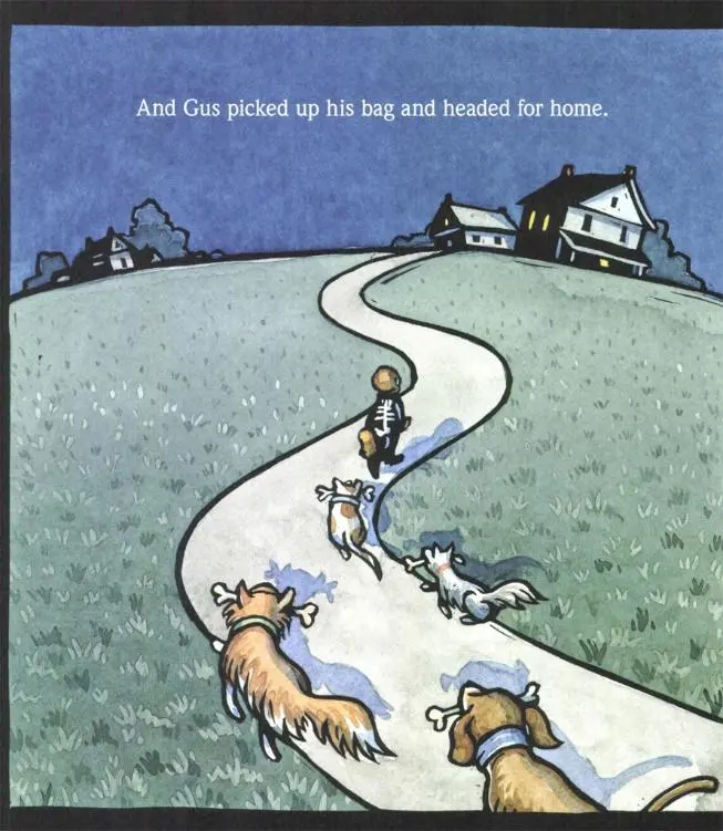 사탕으로 묵직해진 가방을 들고 집으로 돌아오는 길, 공동묘지를 지나던 거스는 그만 마주쳐서는 안 될 것과 마주치고 만다. 바로 묘지에서 기어 나온 해골들! 해골들이 자신을 동료로 착각하자 당황한 거스는 분장을 벗어버리고, 말랑말랑한 살갗에 입맛을 다시는 해골들에게 둘러싸인다. 해골들이 뼈를 딱딱거리며 다가오는 바로 그 순간, 어디선가 낯익은 울음소리가 나더니 작은 뼈다귀 개가 허공에서 연기처럼 나타난다.
