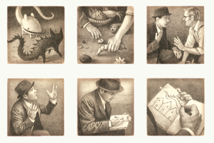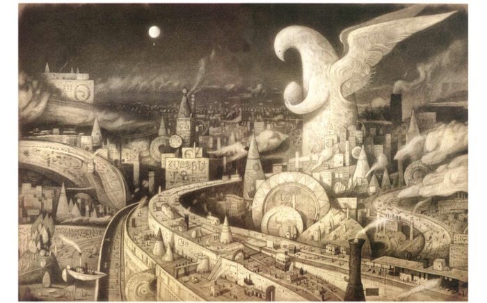 그의 대표작인 <도착>은 이민자의 이야기를 다루고 있다. 익숙한 곳을 떠난 주인공이 막 도착한 도시는 암호 같은 글자와 거대한 괴물들로 가득한 괴상한 곳이다. 오래된 필름영화를 연상시키는 흑백 일러스트에서 말 통하는 이 하나 없는 낯선 세계에 대한 두려움과 막막함, 두고 온 가족들에 대한 그리움과 외로움이 물씬 묻어나온다.