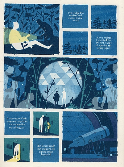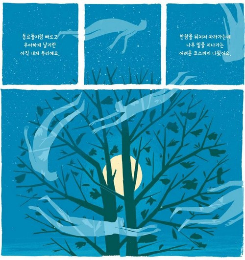 그의 첫 그림책 『새내기 유령』은 첫 임무 수행을 나온 유령과 별의 탄생을 발견하고 싶어하는 천문학자가 만나며 펼쳐지는 이야기다. 나무에 걸리는 바람에 무리에서 뒤처진 이 초보 유령은 때마침 밤하늘을 관찰하던 천문학자의 도움을 받아 동료 유령들을 찾아나선다. ‘임무’를 수행하는 동료들의 모습을 목격한 유령은 충격에 빠지고, 임무를 수행하는 대신 천문학자의 꿈을 돕기로 결심하지만 설상가상 동료들에게 쫓기게 된다. ‘사람은 죽어서 별이 된다’는, 누구나 한번쯤 해 본 상상을 바탕으로 탄생한 이 작품은 전문적인 과학 이론 대신 삶과 죽음이라는 철학적인 주제로 연결된다. 생의 여러 순간이 그렇듯 유령에게도 ‘처음’이 존재한다거나, 육신을 떠난 영혼을 밤하늘로 데려다주는 게 그들의 역할이라는 아이디어도 반짝이지만 가장 매력적인 건 결말 부분의 소소한 반전이다. 공존할 수 없을 것 같던 유령의 임무와 천문학자의 꿈이 서로를 발판삼아 이루어지는, 비극인 듯 희극 같은 반전은 독자의 마음에 오래도록 여운을 남긴다. 이 작품을 읽은 독자라면, 유난히 고된 하루의 끝에서 밤하늘을 올려다보는 건 어떨까. 묵묵히, 그러나 환한 빛을 뿜으며 우리를 내려다보는 낯익은 얼굴을 발견하게 될지도 모르니 말이다.