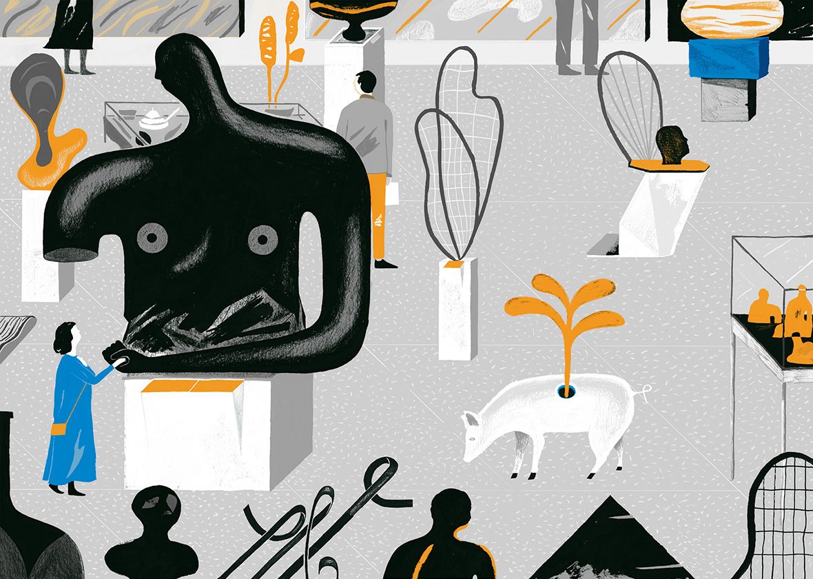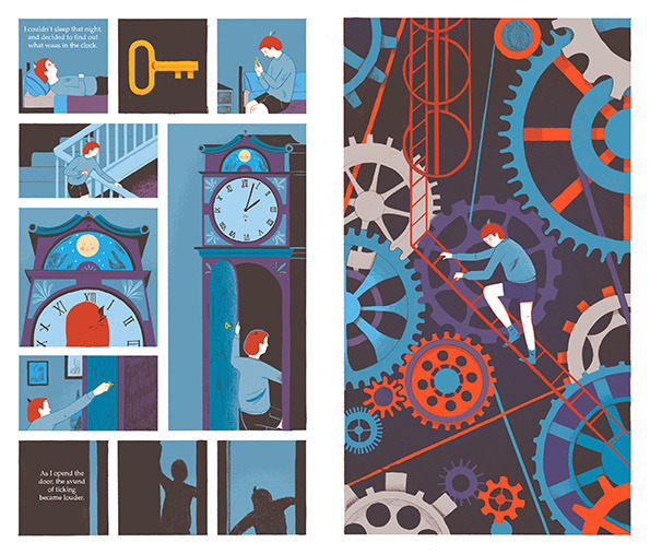 『새내기 유령』이 별이 총총한 밤하늘이나 푸른색을 통해 신비한 느낌을 풍겼다면, 또 다른 그림책 『하루의 설계도』는 태양을 연상시키는 붉은색과 노란색으로 강렬하고 열정적인 느낌을 풍긴다. 이 작품은 프롤로그 형식으로 태초의 시작을 다룬 첫 번째 챕터와, 할아버지의 괘종시계 속에서 또 다른 세계를 찾아낸 소년이 등장하는 두 번째 챕터로 이루어져 있다. 헌터는 전작에 이어 이번에도 ‘이과적’인 소재를 ‘문과적’인 시각으로 풀어낸다. 설명 불가능한 사랑이라는 감정으로 태양이 움직이고 바닷물이 밀려들어왔다 빠져나가는 자연 현상을 설명하는 것이다. 우주가 탄생하는 순간 태양을 짝사랑하게 된 지구, 우주의 소멸을 막기 위해 짝사랑을 방해해야만 하는 인물들 같은 설정도 재미있다. 헌터의 그림책을 읽다 보면, 어쩌면 진정한 예술이란 이렇게 서로 반대되는 분야를 어우를 때 탄생하는 것인지도 모른다는 생각이 들기도 한다.