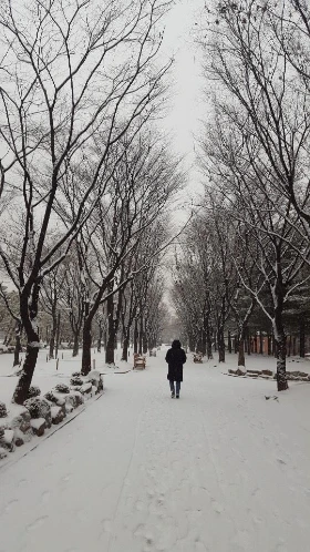 도시 속에서 쉽게 맛볼 수 없는 출근길이다. 항상 나의 두 발로 사시사철 느낄 수 있는 경치를 걷고 있다. 얼마나 즐거운 일인가. 찬바람도 불지 않는 오늘, 하얗게 솜털처럼 내리는 흰 눈과 함께 나의 발걸음도 가벼워진다.