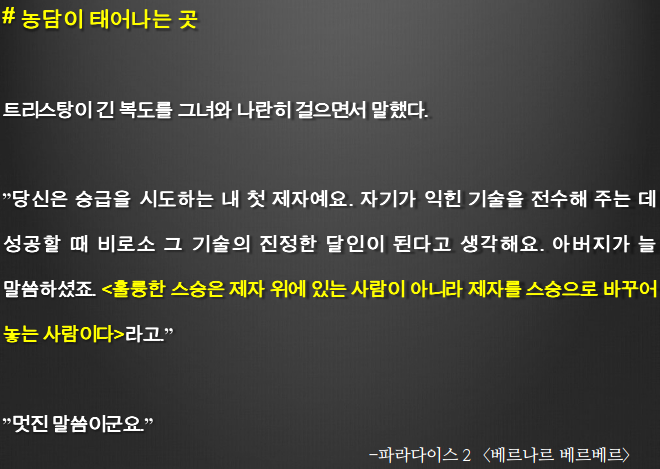“자유의지가 있냐 없냐가 중요해. 잘할 수 있다고 믿는데. 교육자로써 두려움보다 스스로 자유의지가 있냐고 다시 물어보고 싶군. 열정이지 뭐. 대답해.”