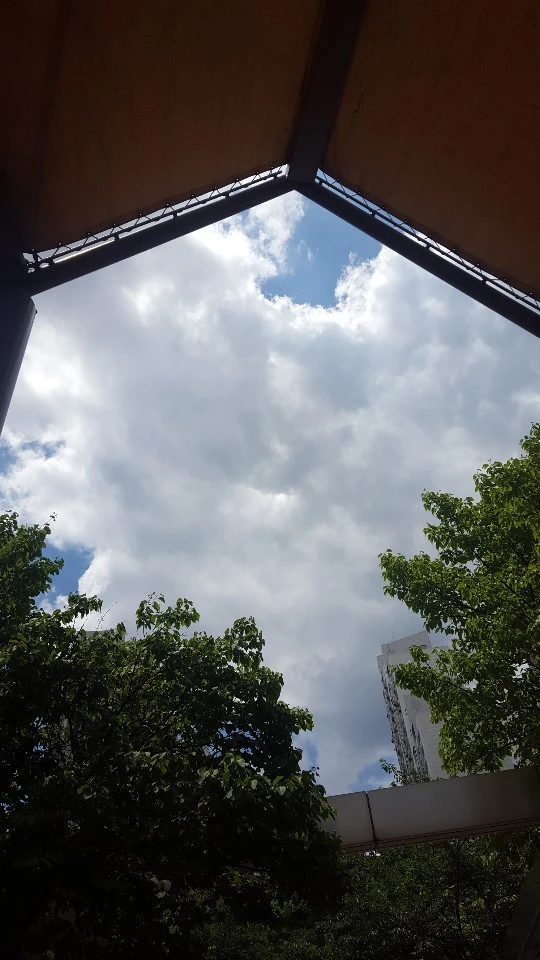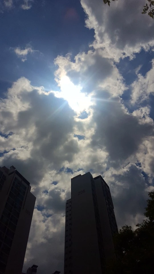 작은 존재인 인간. 아파트라는 인위적인 건물들 사이에 펼쳐진 저 광활한 바다와 햇살에 비치는 하얀색 물감이 진하게 때로는 옅게 뿌려지는 그것은 파란 하늘 아래 구름이다. 일요일이라는 정적이며 행복한 요일과 오전이 상쾌함을 배경으로 시원한 바람을 느끼며 구름 하늘을 바라보니 참 좋았다. 찌그러진 모양에 브라운색을 띤 내 세계에서 펼쳐진 광경은 놀랍도록 평화로움으로 다가왔다. 이 느낌은 흡사 주말이면 어김없이 찾아다니던 캠핑장에서 느끼는 나른한 주말과 같았다. 넓고 넓은 우주만큼이나 깊고 깊은 심해와 같은 구름 하늘은 이렇게 놀이터에서 내 선글라스를 통해 다가왔다. 집에 나오길 잘했네.