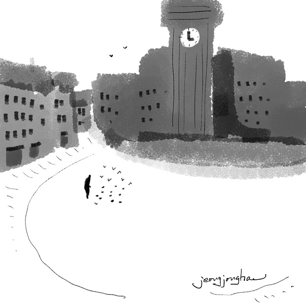 광장 한편에서 모이를 주던 남자가 새들에게 전하는 말들을