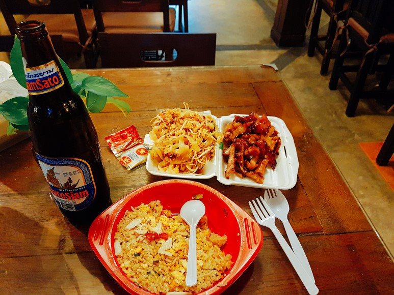 하지만 숙소에 짐 푼 뒤 그냥 길거리에 보이는 길거리 음식에 맥주를 사서 먹은 순간 그 우울함과 허리 통증이 한 번에 사라지는 느낌이었다. 여행하는 동안 태국 음식은 입에 잘 안 맞다고 생각했는데 이날 먹은 저 음식들이 태국여행 중 가장 맛있었다. ㅋㅋ 사실 태국 음식인지는 잘 모르겠다.