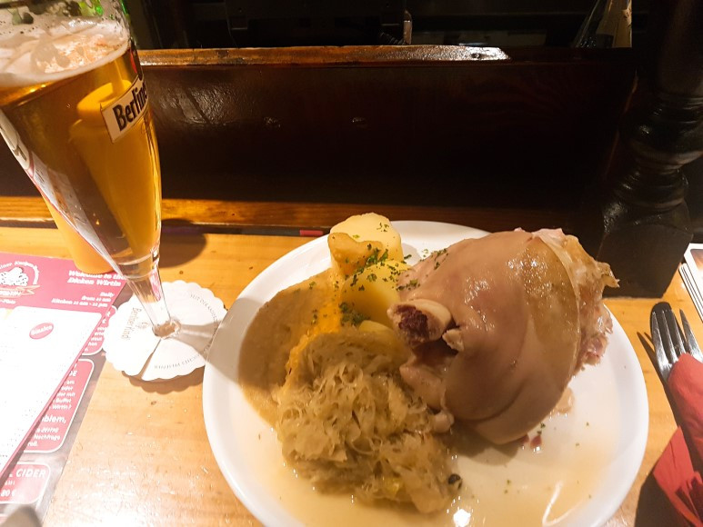 그래도 독일 하면 가장 첫 번째로 떠오르는 것은 역시나 맥주 아닌가. 매일 마다 맥주를 마셨는데 중요한 건 무엇과 함께 먹느냐 였다. 첫 음식은 바로 돼지 무릎(?) 음식. 독일 족발이라고 불리는 슈바인학센은 아니지만 그와 비슷한 음식을 찾다가 이 메뉴를 시켰다. 가격은 약 12유로 정도 독일 물가 치고는 괜찮았다. 양도 꽤 많고.