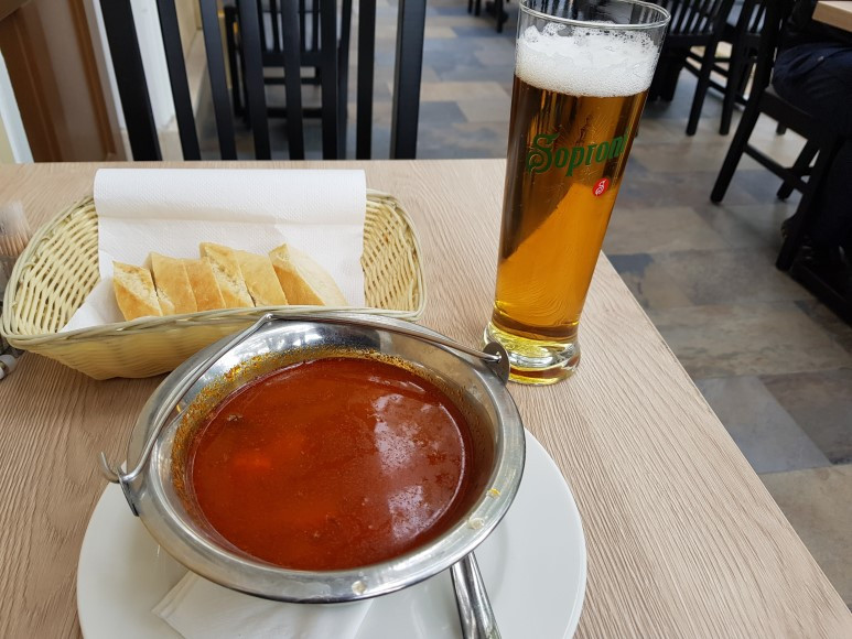 그래도 헝가리에 왔으면 전통음식은 먹어야지라는 생각으로 전통음식 굴라쉬를 시켜봤다. 소고기 스튜라는데 보기에는 아무것도 없는 빨간 국물 같지만 안에 감자, 각종 야채, 소고기 등 들어있고 맛은 한국인의 입맞에는 문제가 없었다. 저기에 빵을 찍어먹는데 꽤 맛있었고 가격도 좋았다.