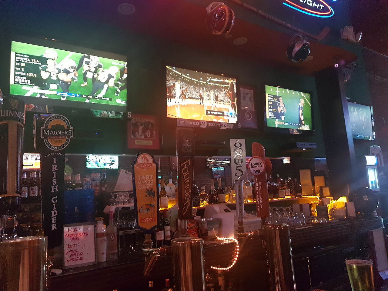 여러 대의 tv와 큰 스크린에 스포츠 경기를 띄워 놓고 자연스럽게 맥주를 마시는 분위기였다. 그날은 nba 파이널의 미리 보는 매치인 골든스테이트와 토론토 경기가 있었기 때문에 난 당연히 메인 스크린에는 농구 경기가 걸릴 줄 알았으나 대부분 미식축구를 보러 온 사람이 대다수였다.